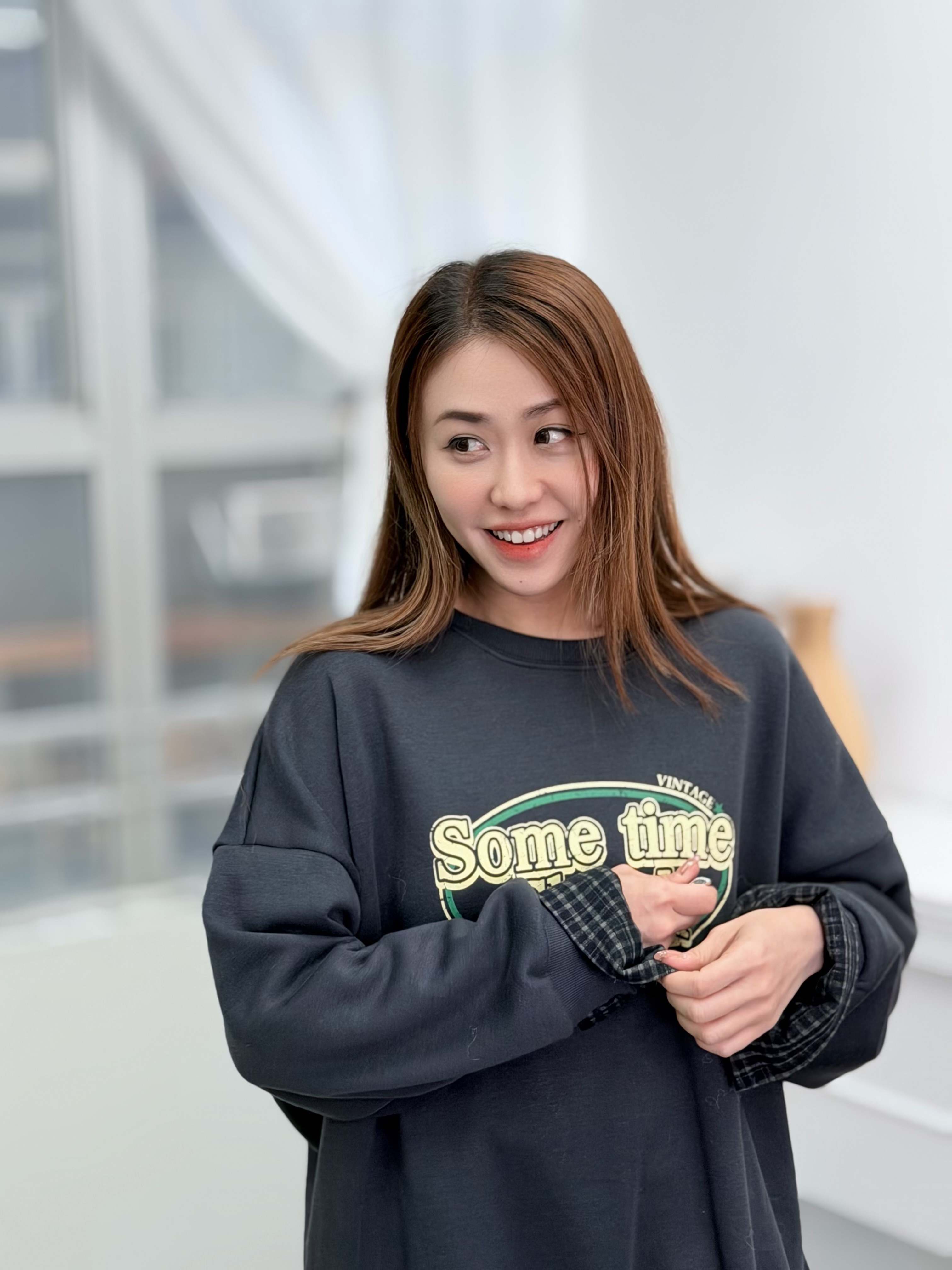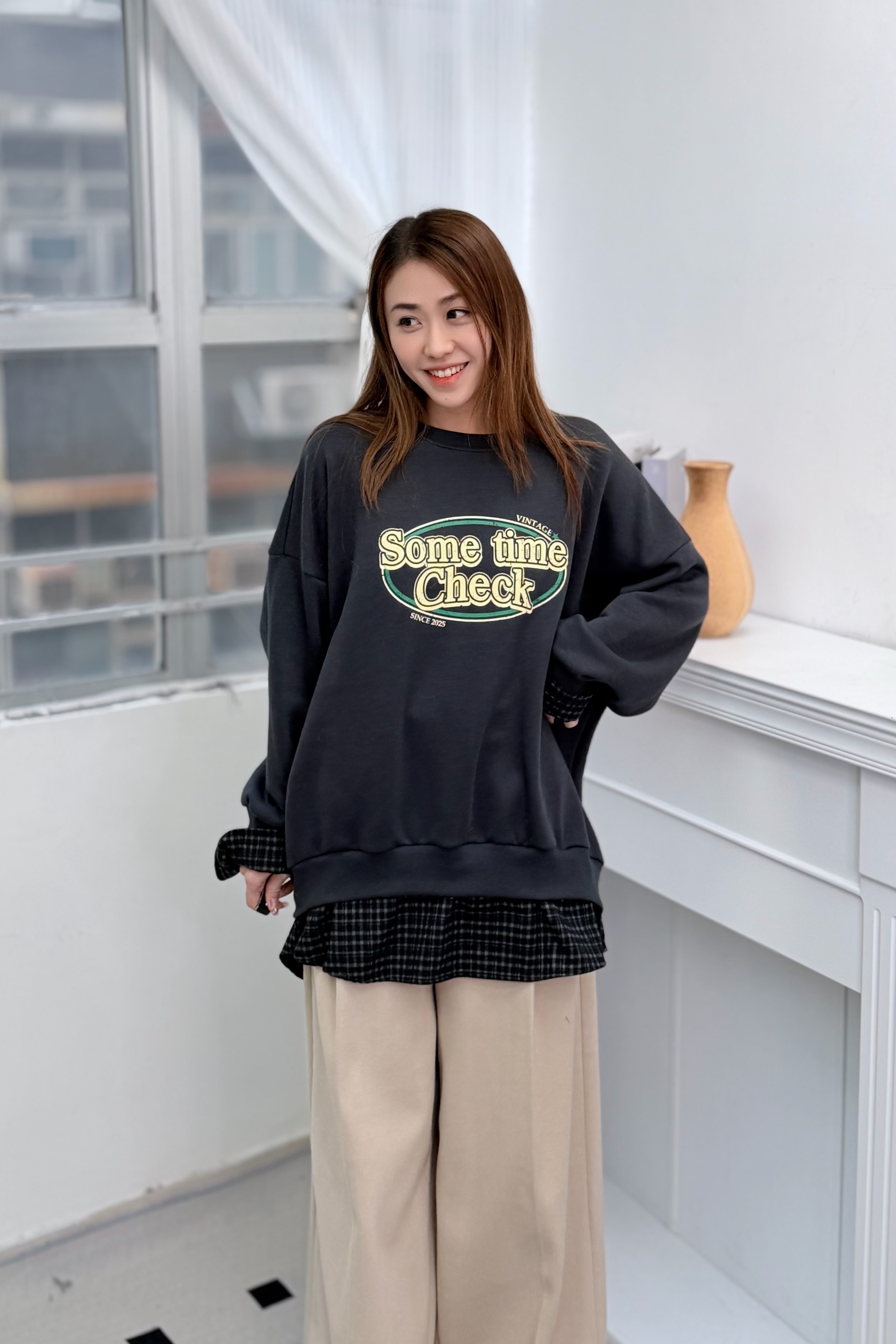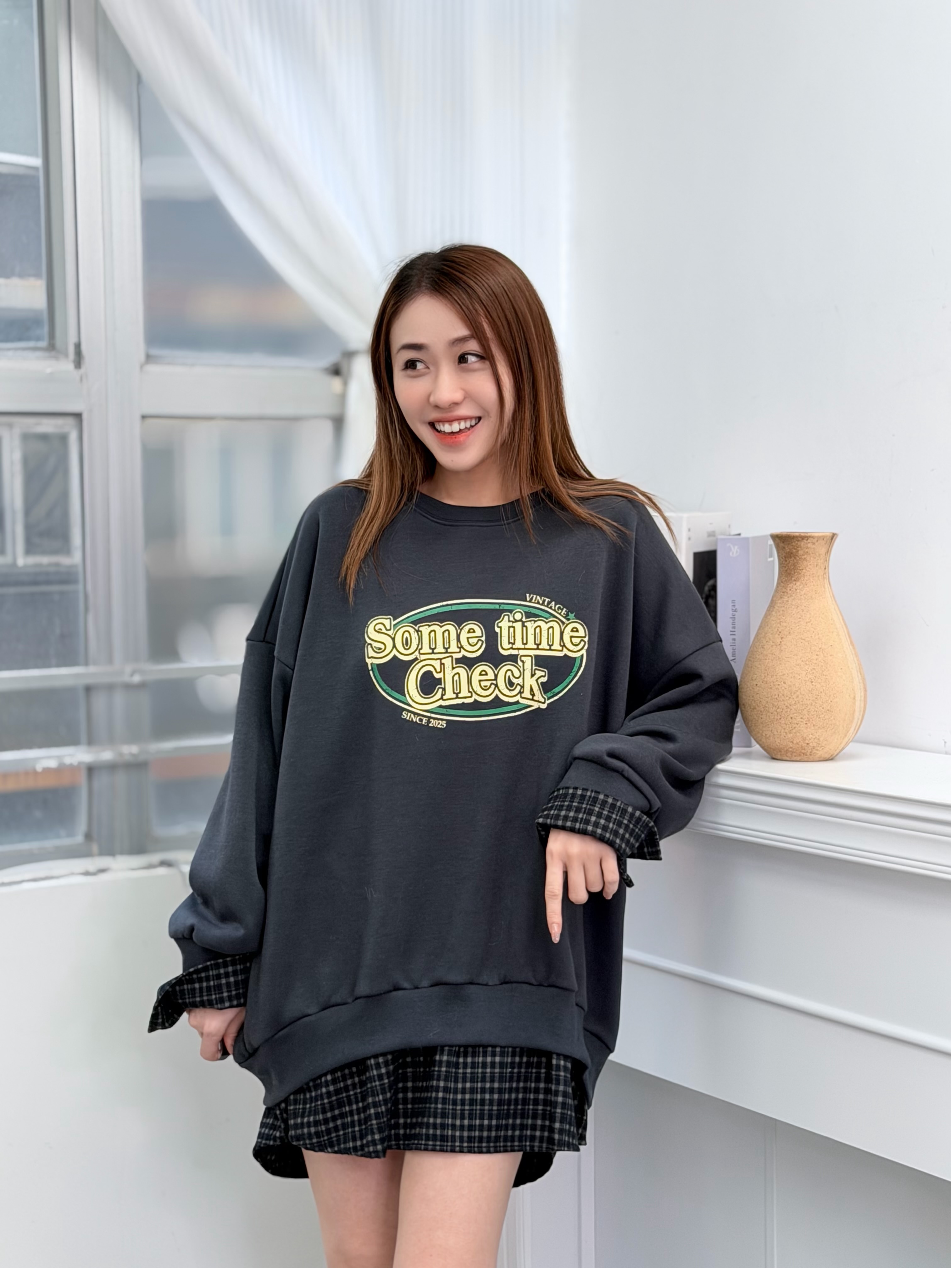 H1027🤎格紋拼接假兩件衛衣