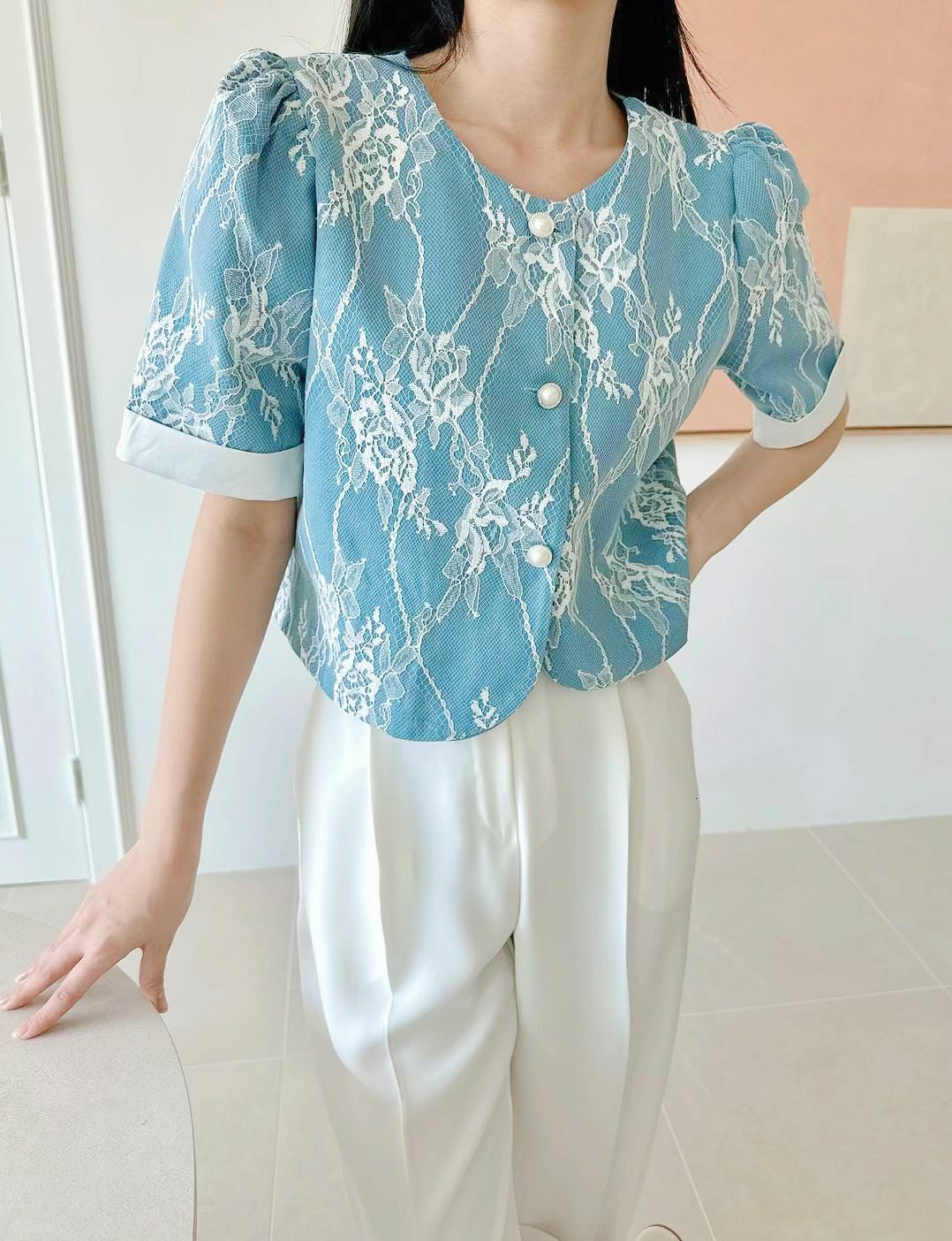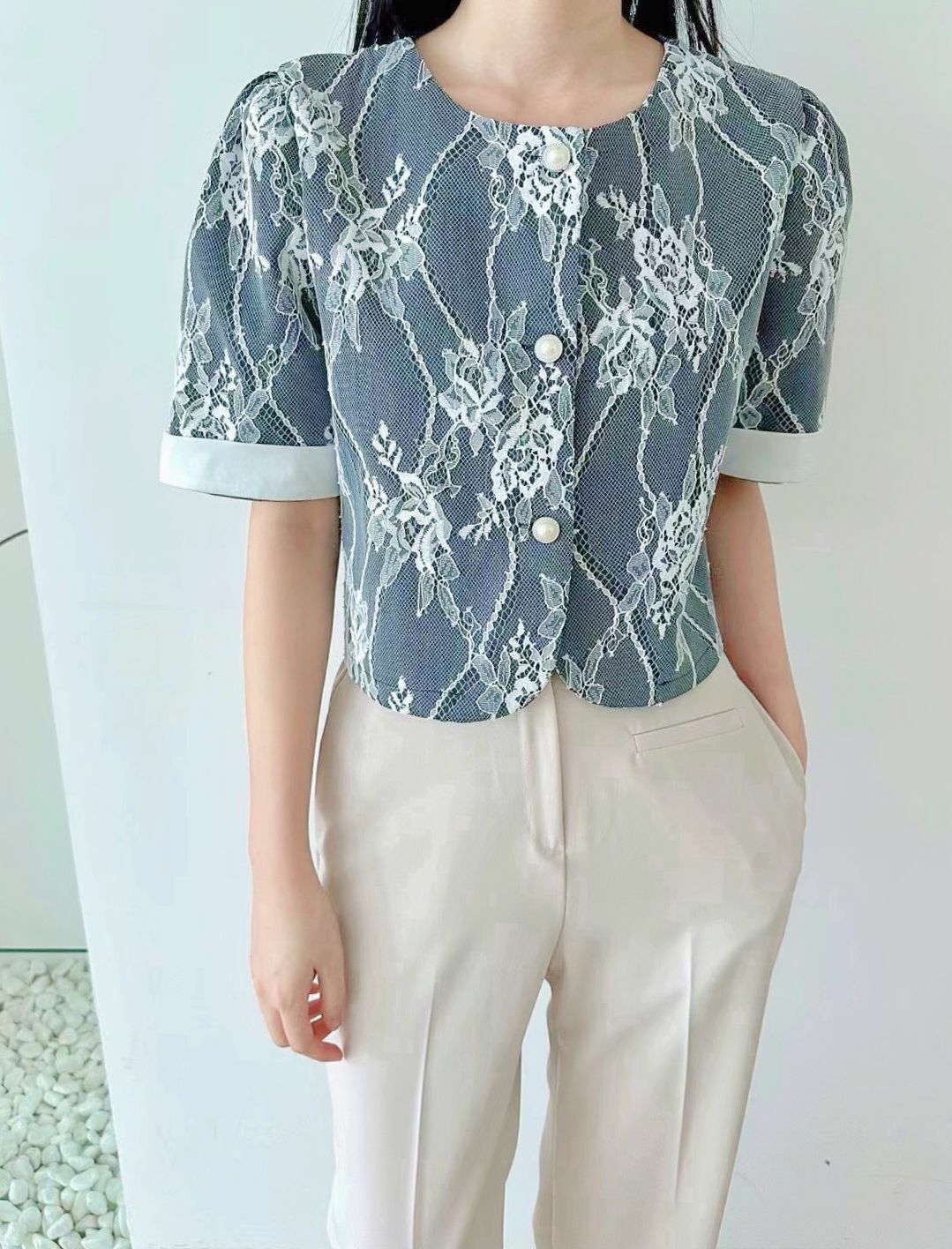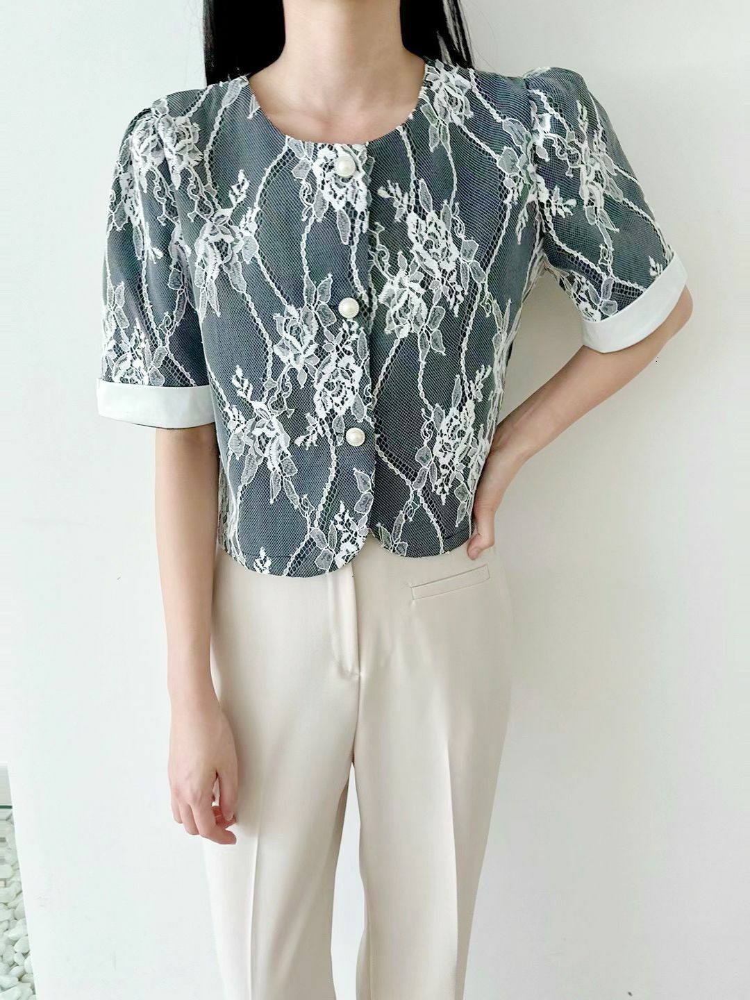 圓領同珍珠鈕扣設計增添咗一份復古嘅味道,袖口嘅翻邊設計亦令整體更加立體有層次。