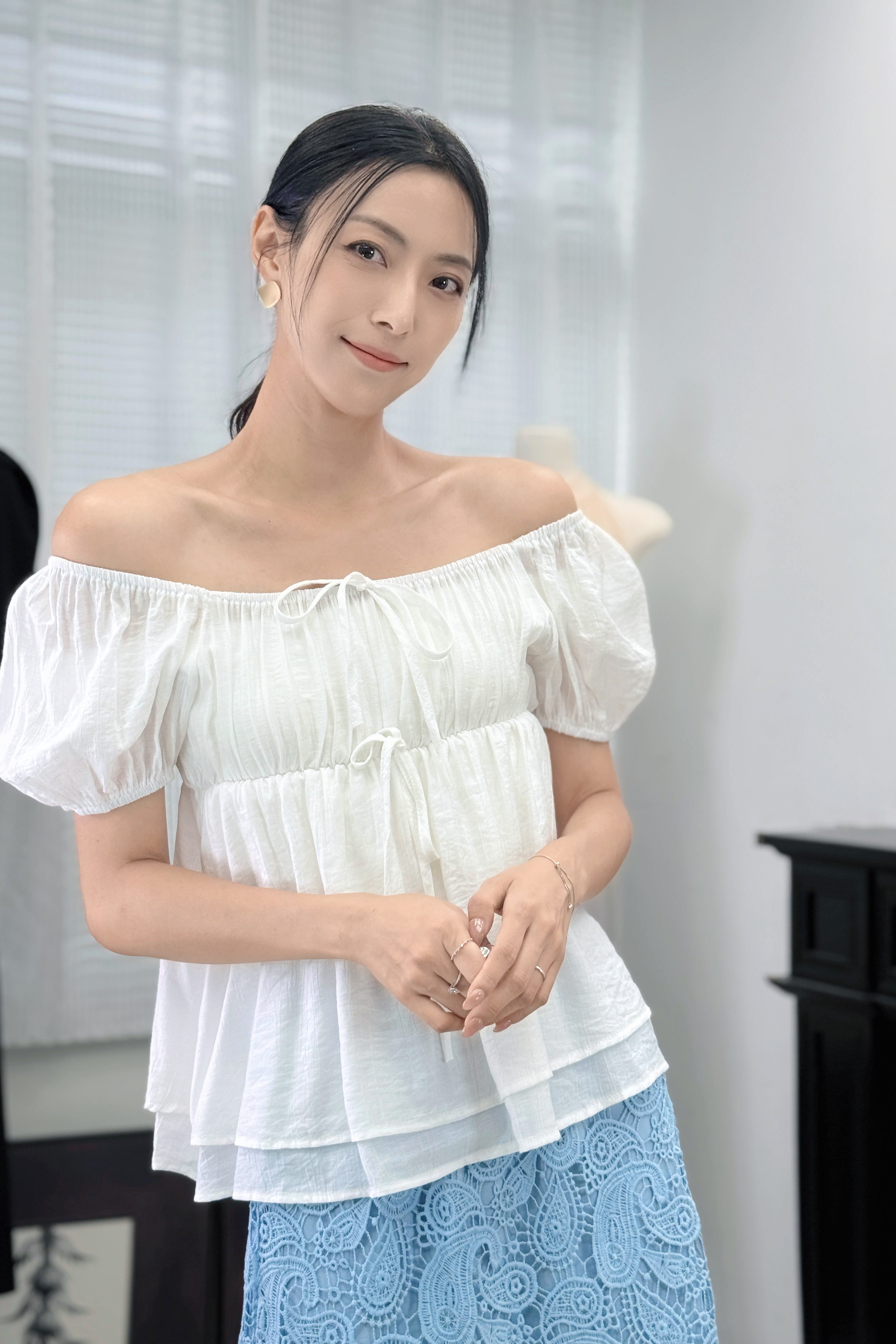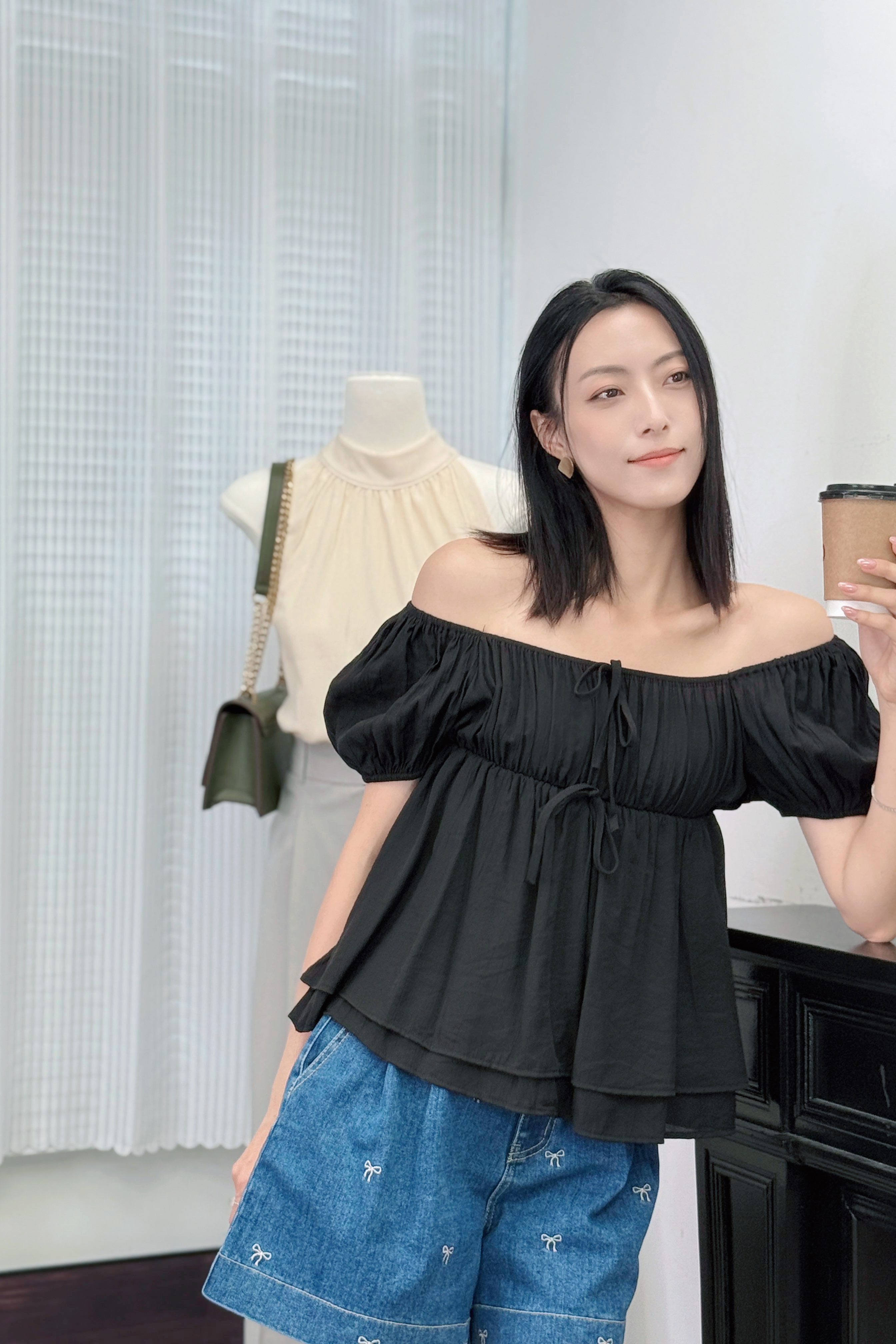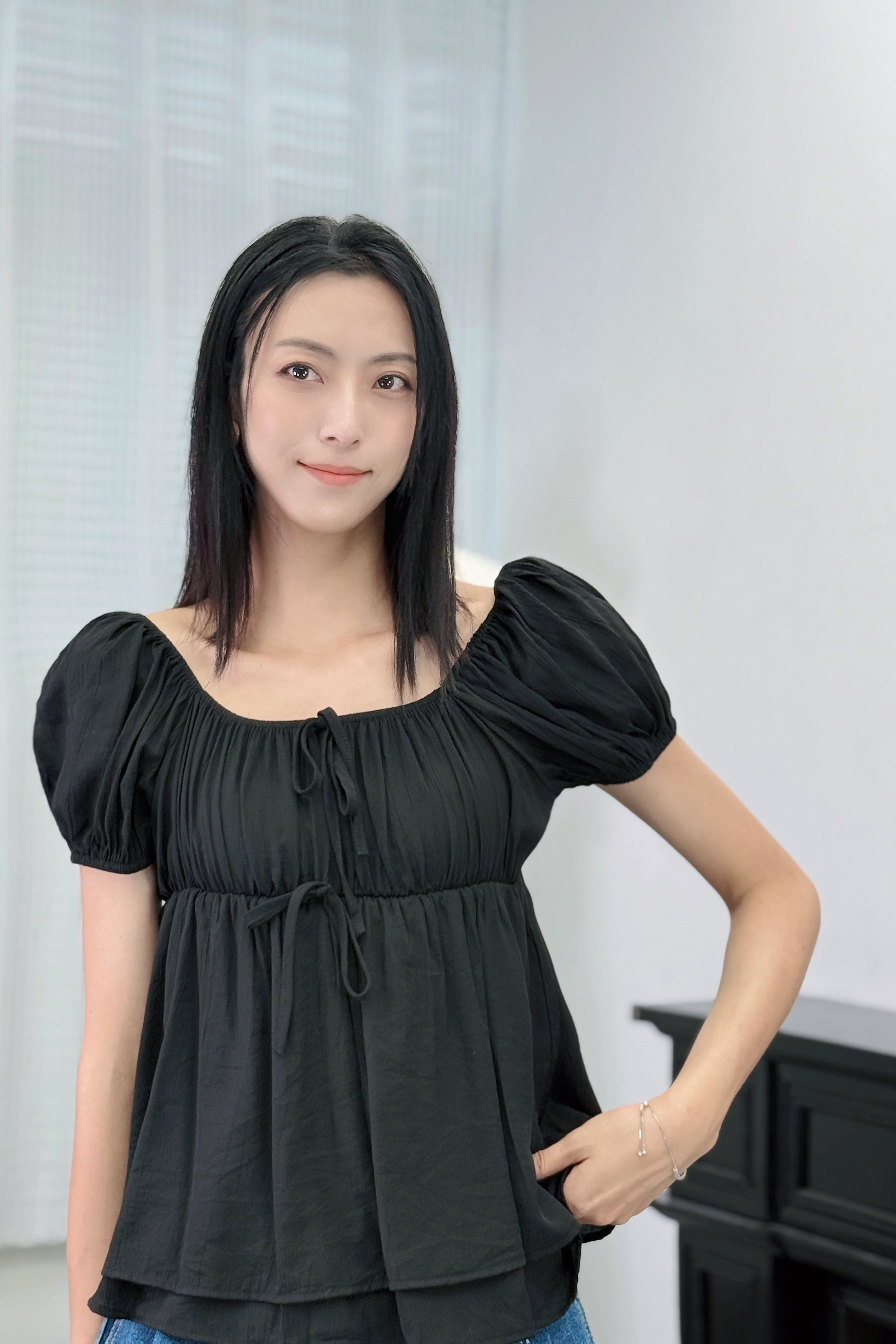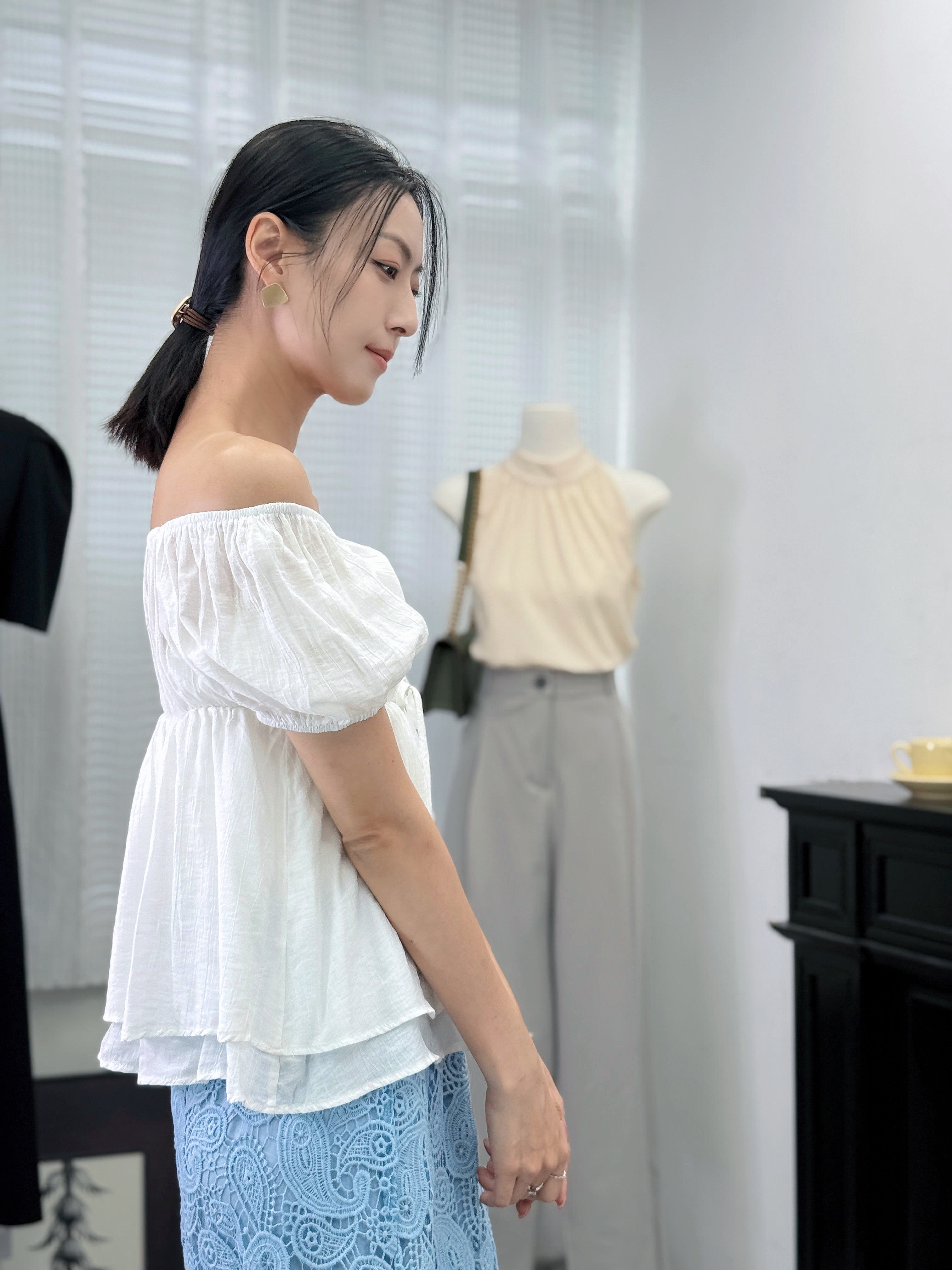袖位係重點!蓬蓬袖用咗橡筋收口,夠穩陣唔易甩,仲可以自然調整長度,上膊一啲就變咗一字肩設計,多咗種穿法,鍾意露膊or唔露都自由轉mode。