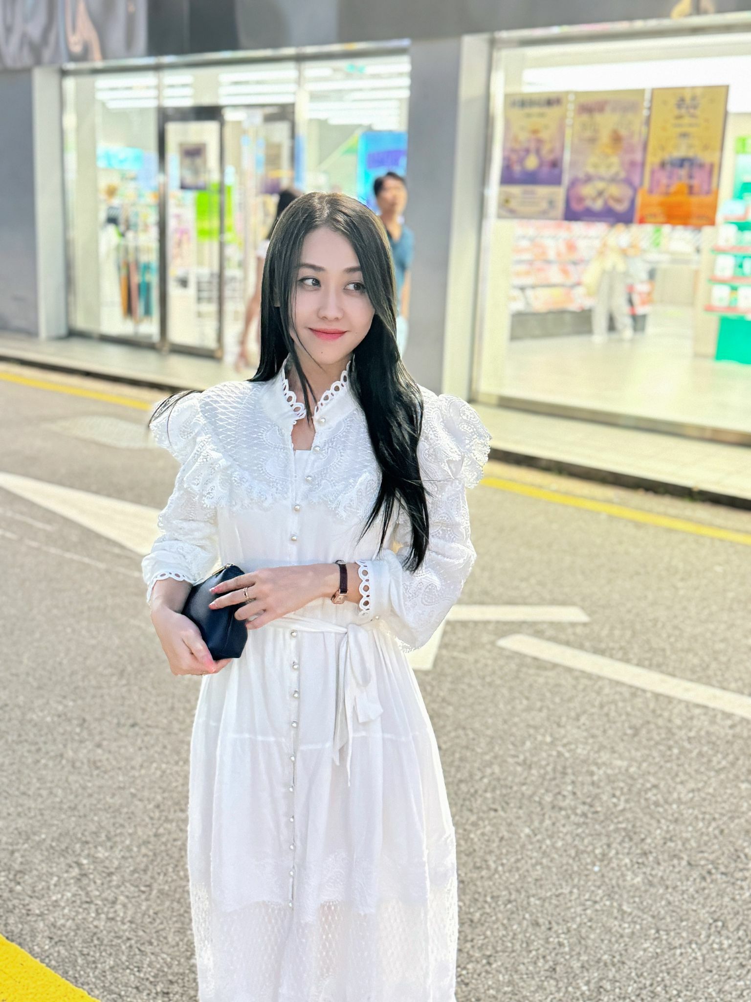 中間用上光澤度極高嘅珍珠做全牌直伸嘅鈕扣,但係連身裙本身已經充滿華麗感覺
