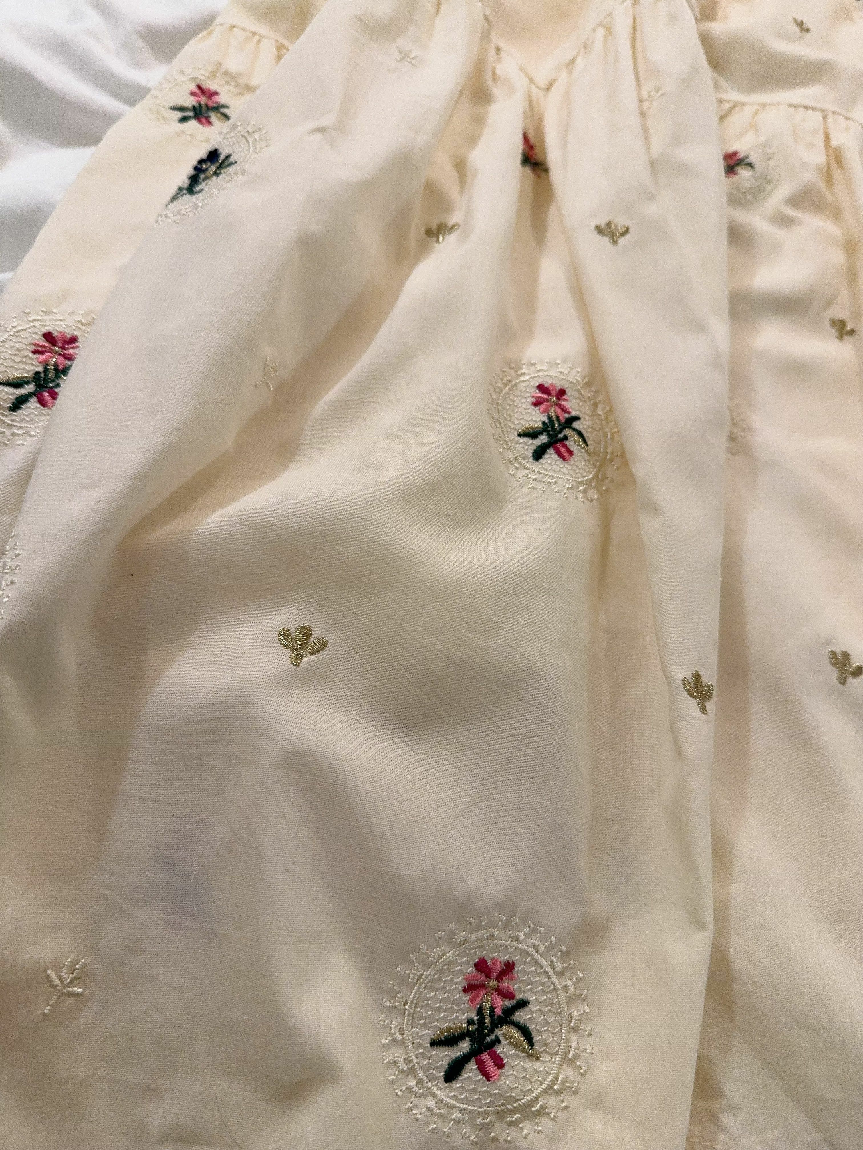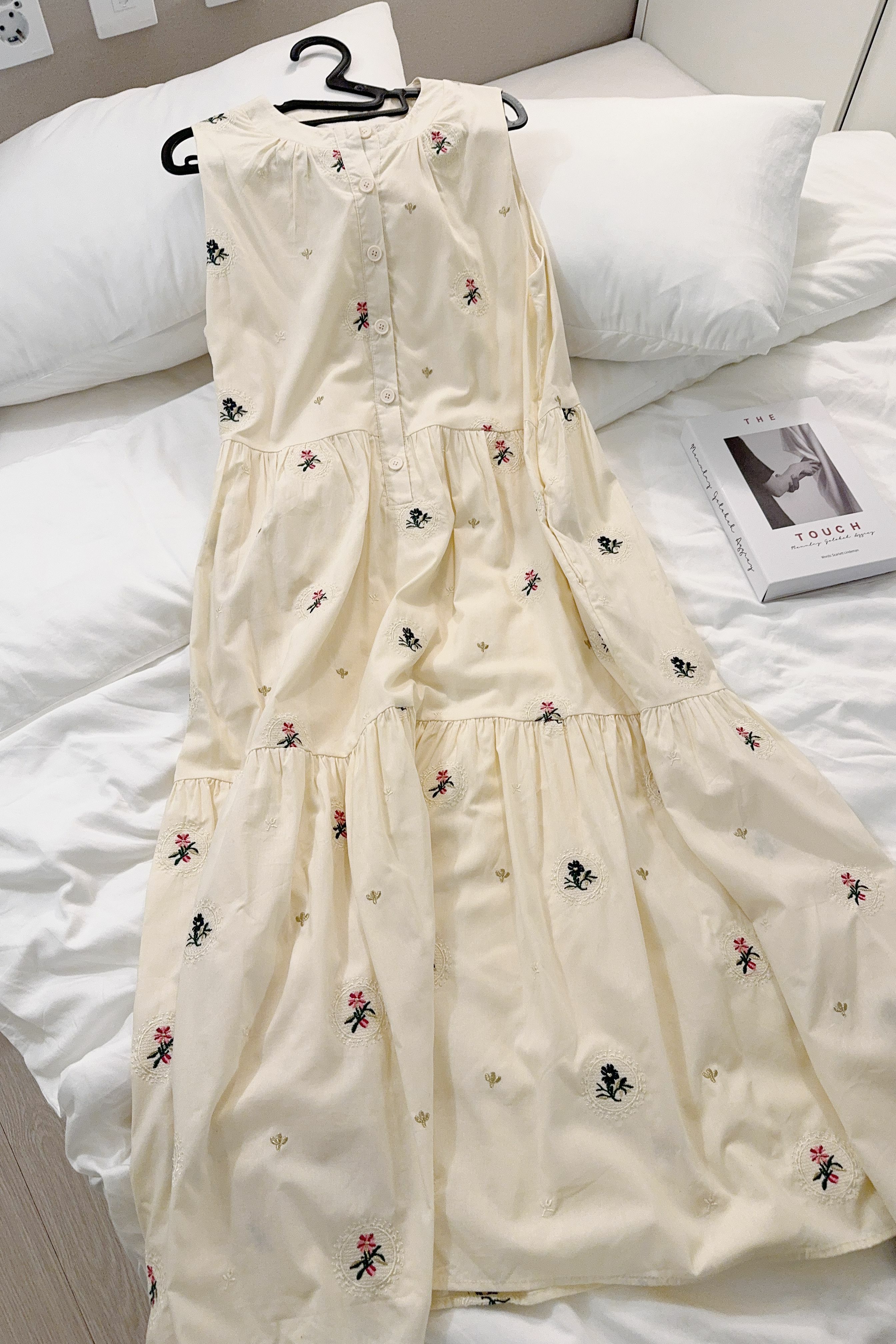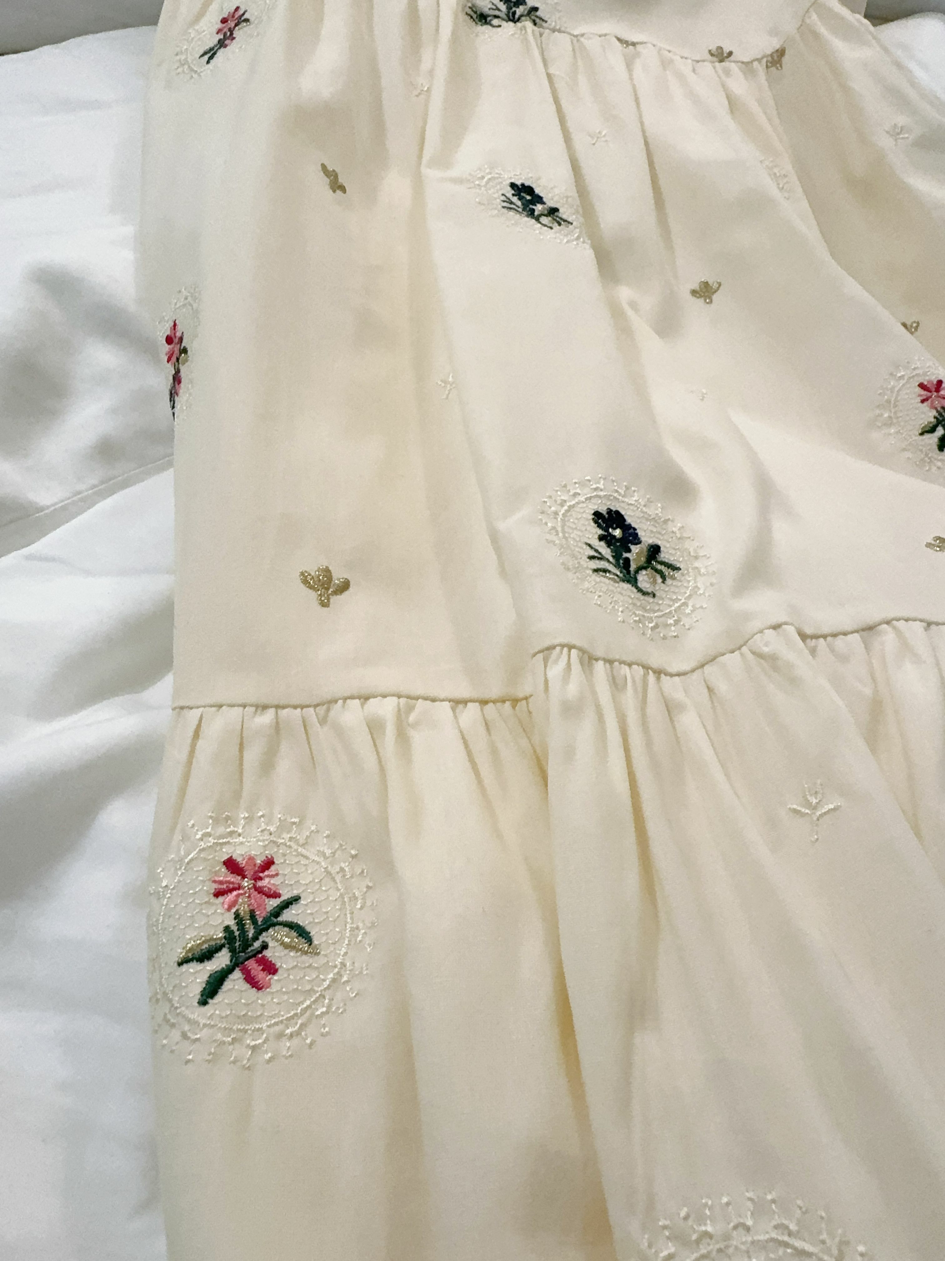 最大嘅特色一定係佢成件裙面滿佈嘅 手感立體感刺繡小花,唔係print,而係真係一針一線繡出嚟嘅點點floral embroidery,仲有唔同色、唔同花形,嗰啲細緻位真係好加分,感覺就係行日系天然系田園風(Natural Zakka Style),帶少少復古童趣,但唔會過cute。