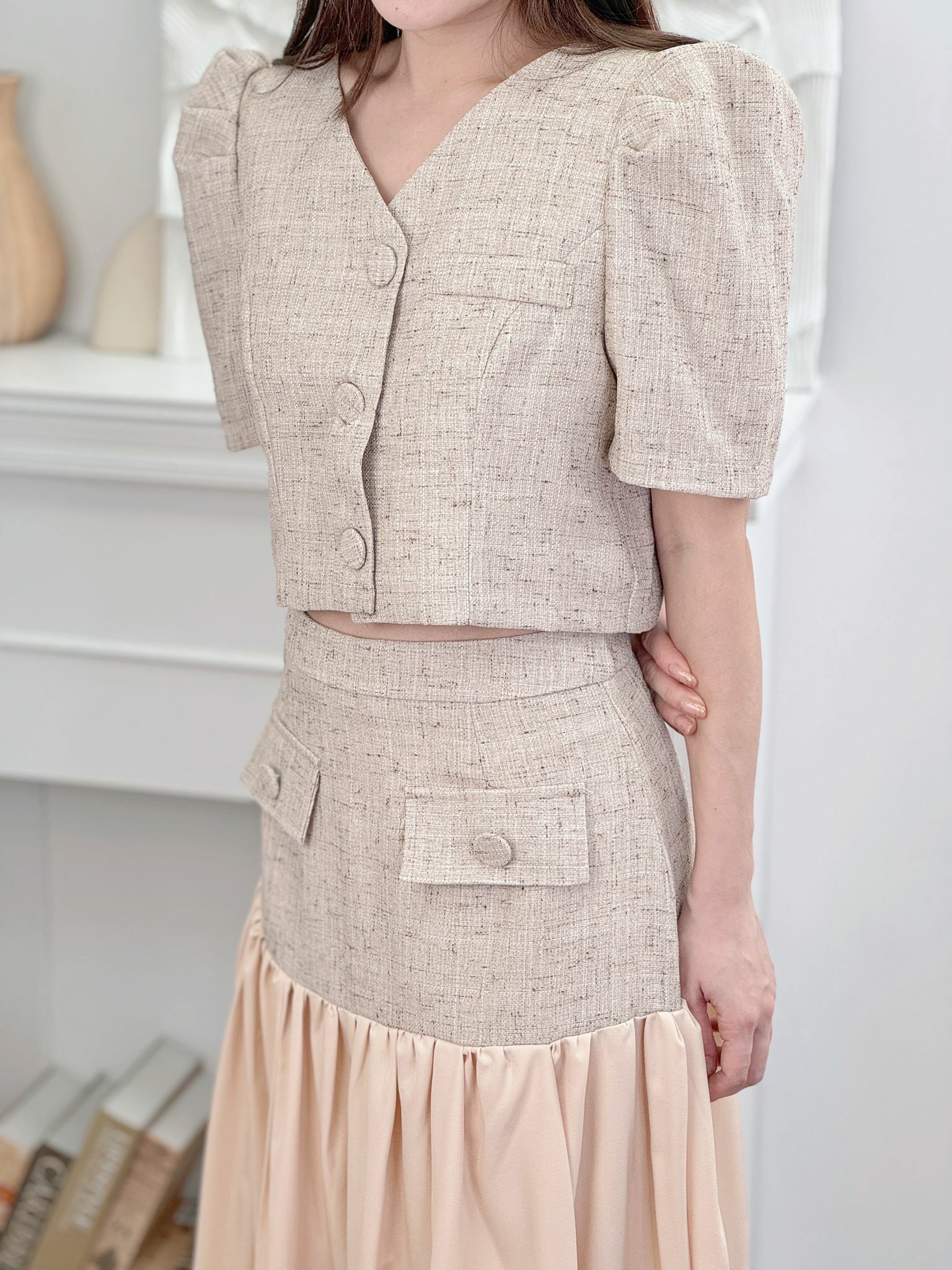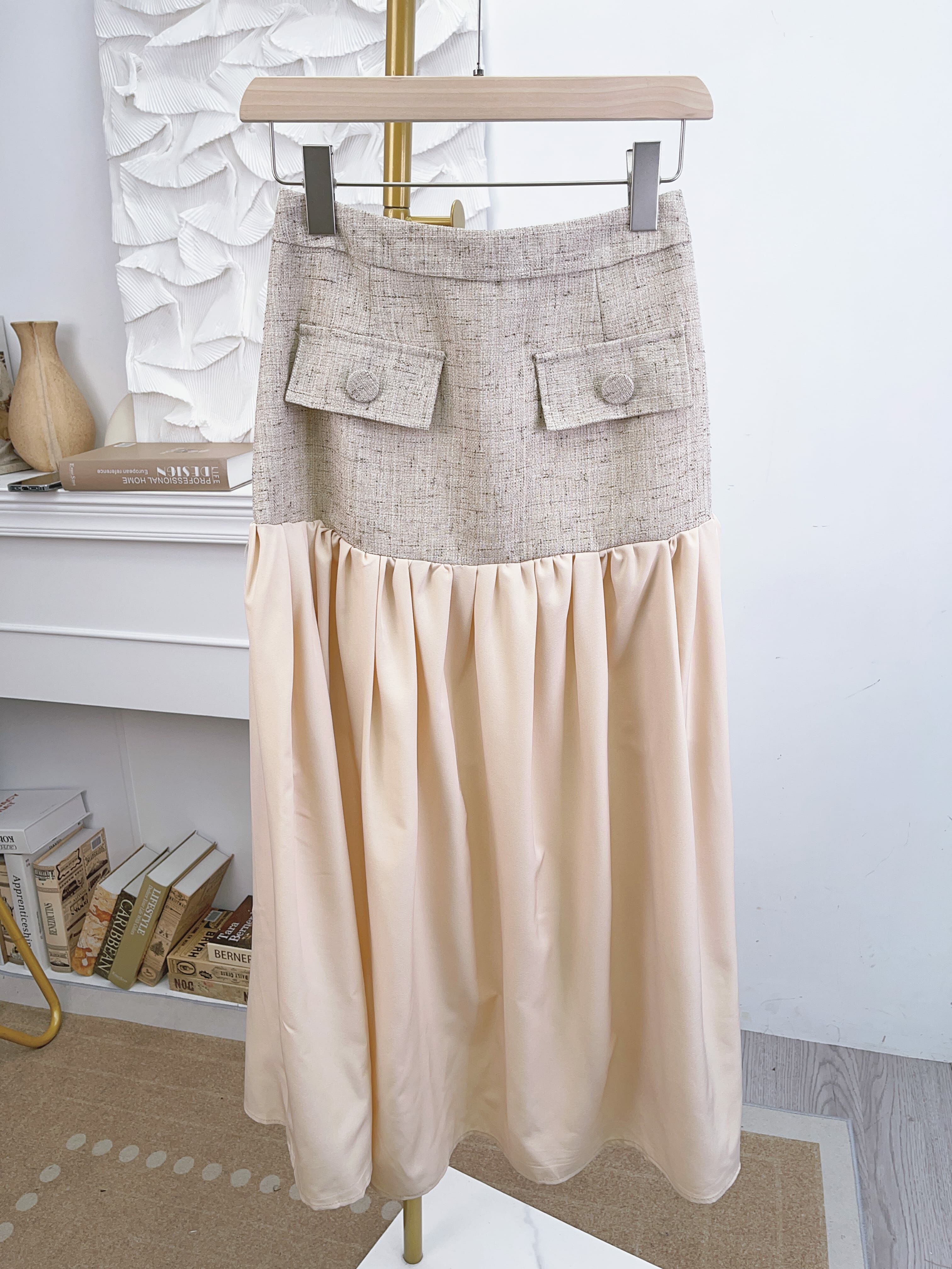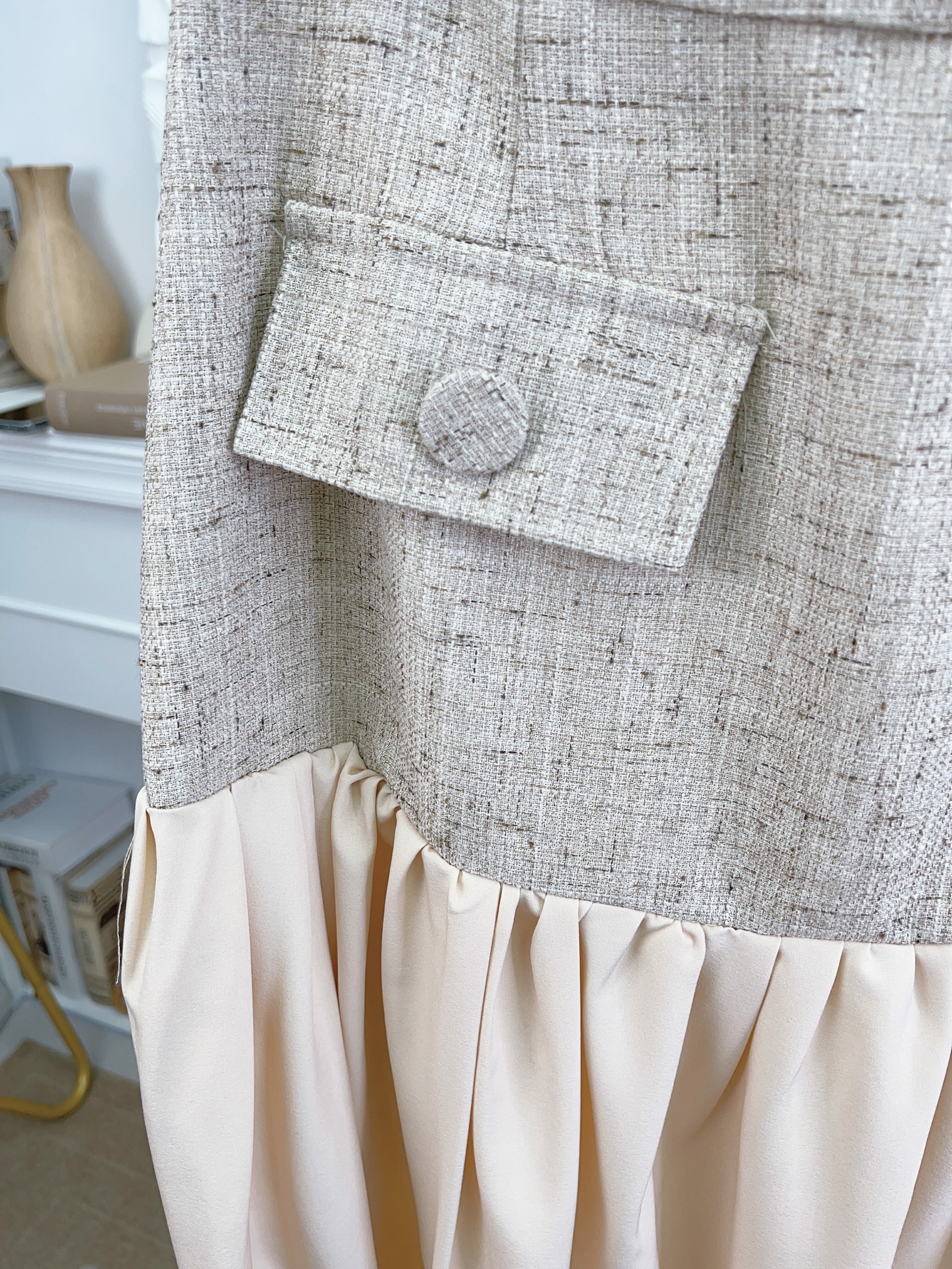 帶麻感嘅tweed料西裝風set 係裙下擺加左一層薄薄嘅飄逸裙擺~不露腿地延長原來的短裙