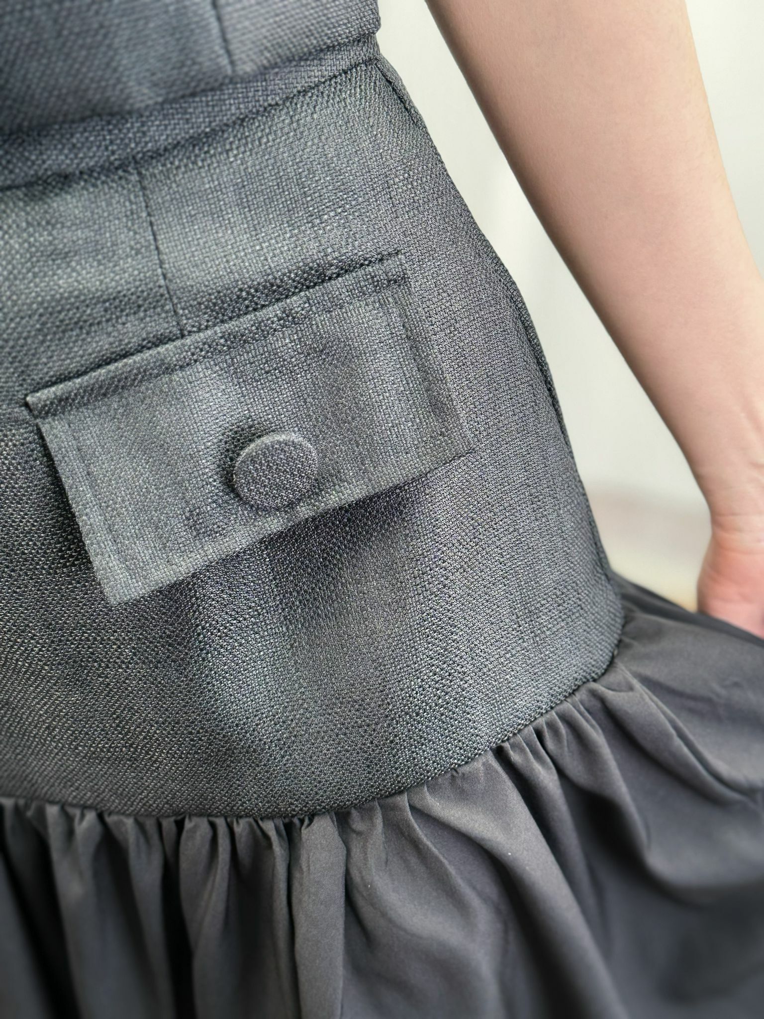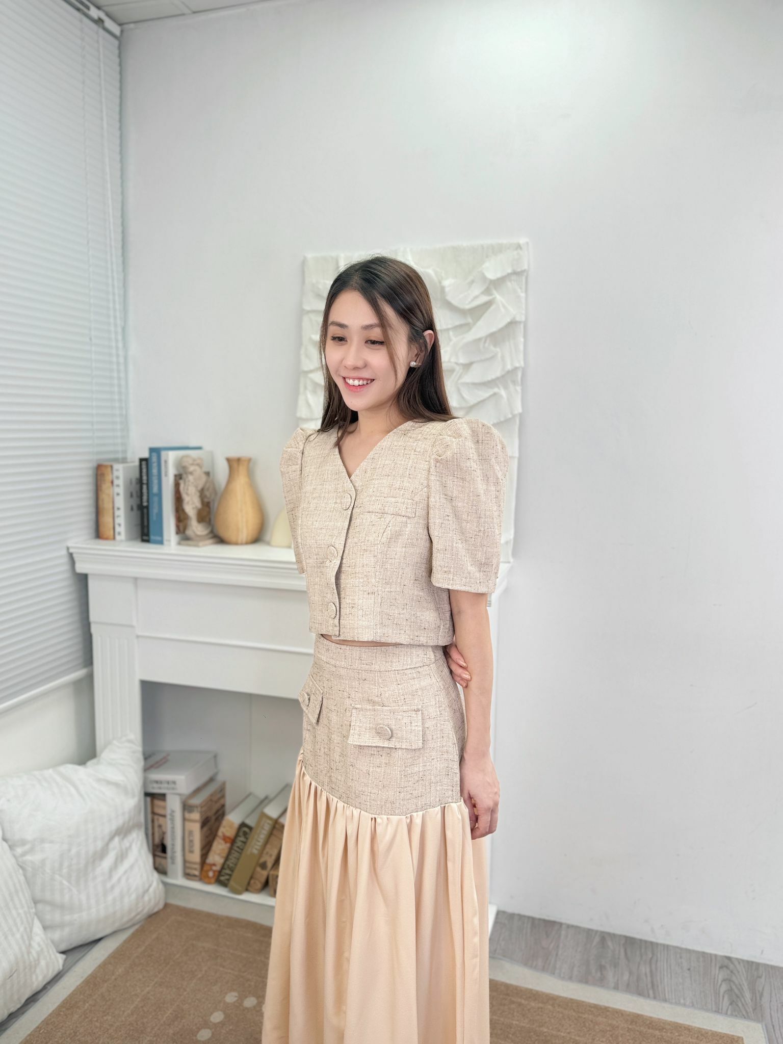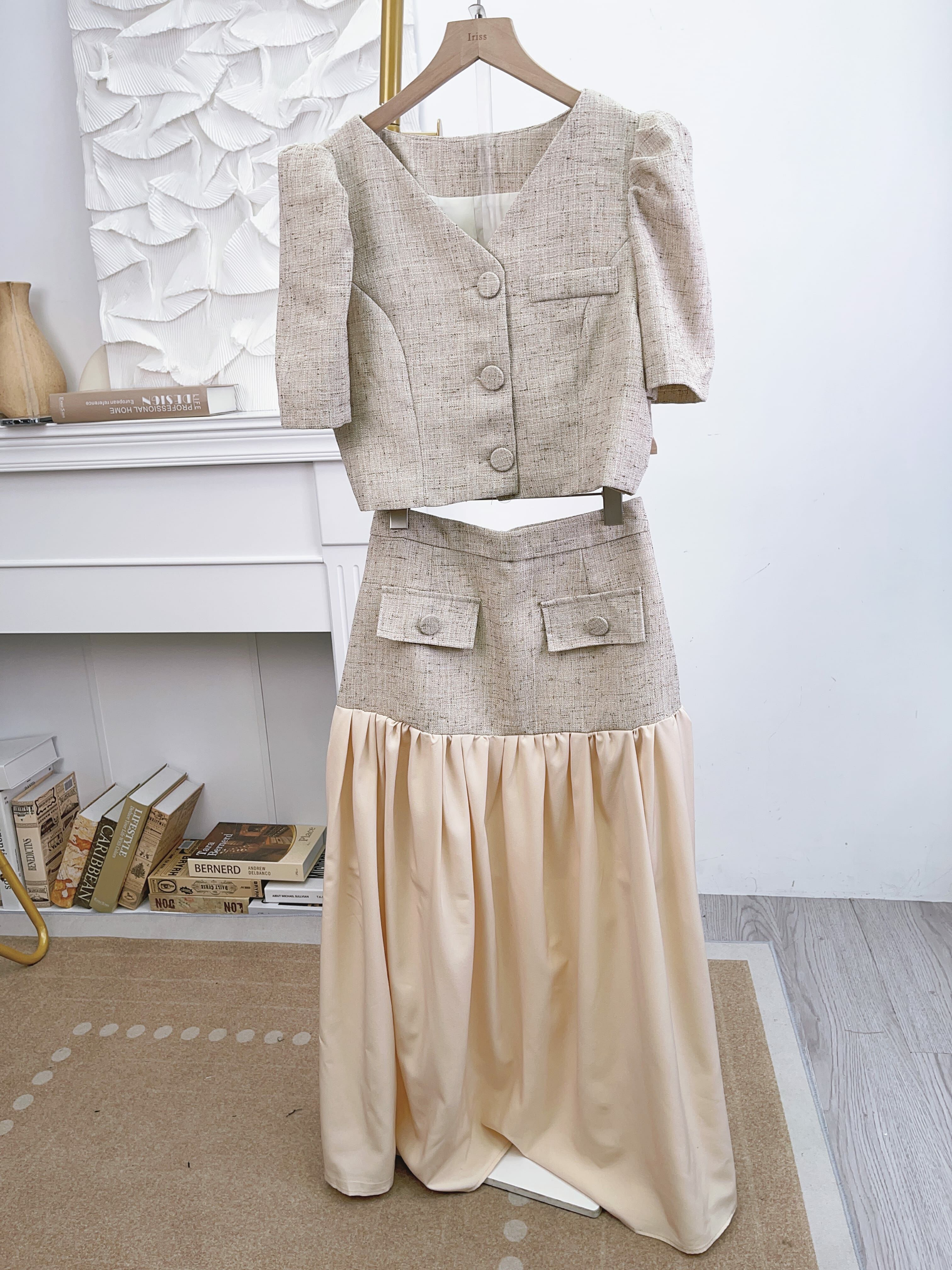 帶麻感嘅tweed料西裝風set 係裙下擺加左一層薄薄嘅飄逸裙擺~不露腿地延長原來的短裙