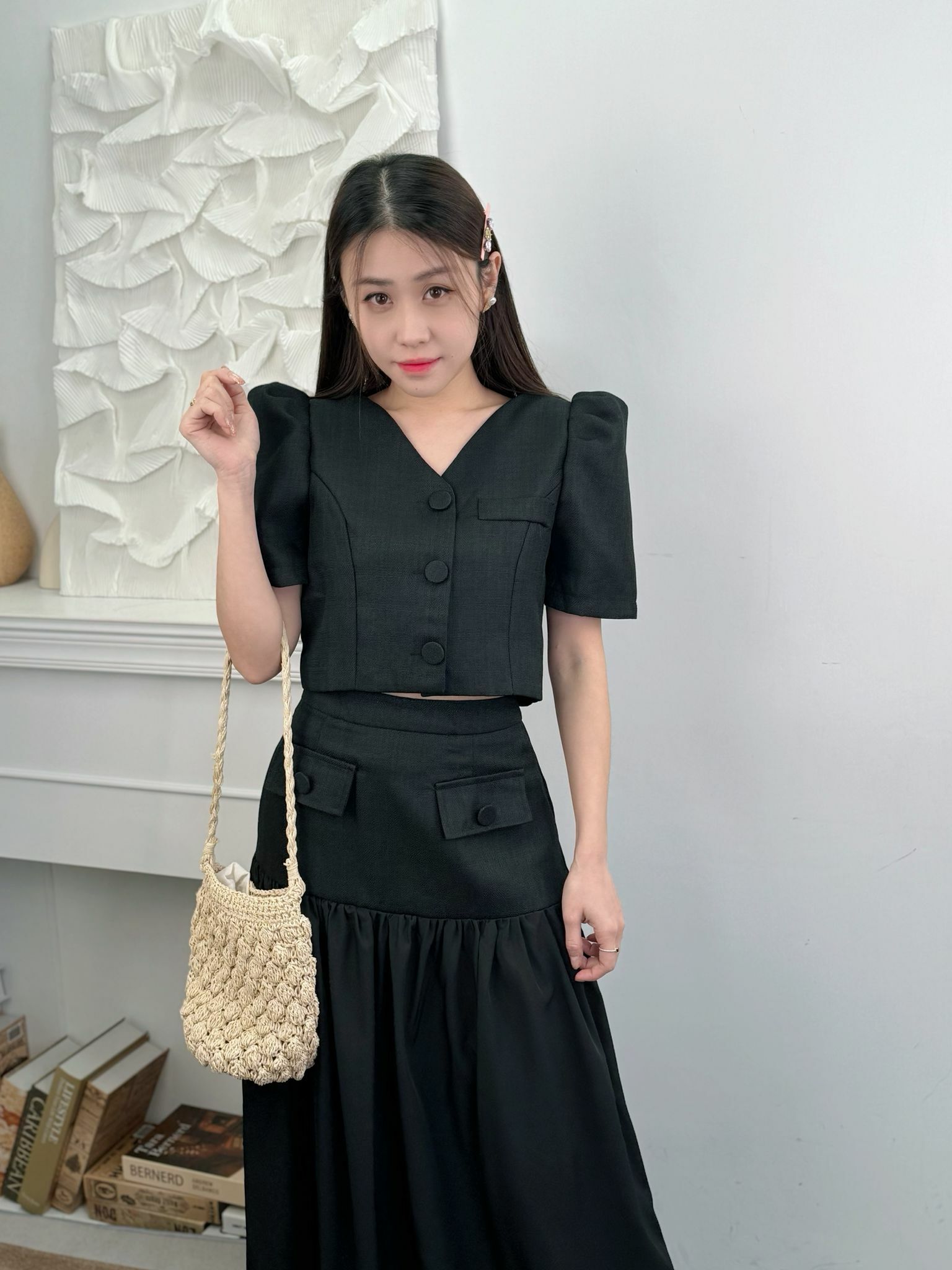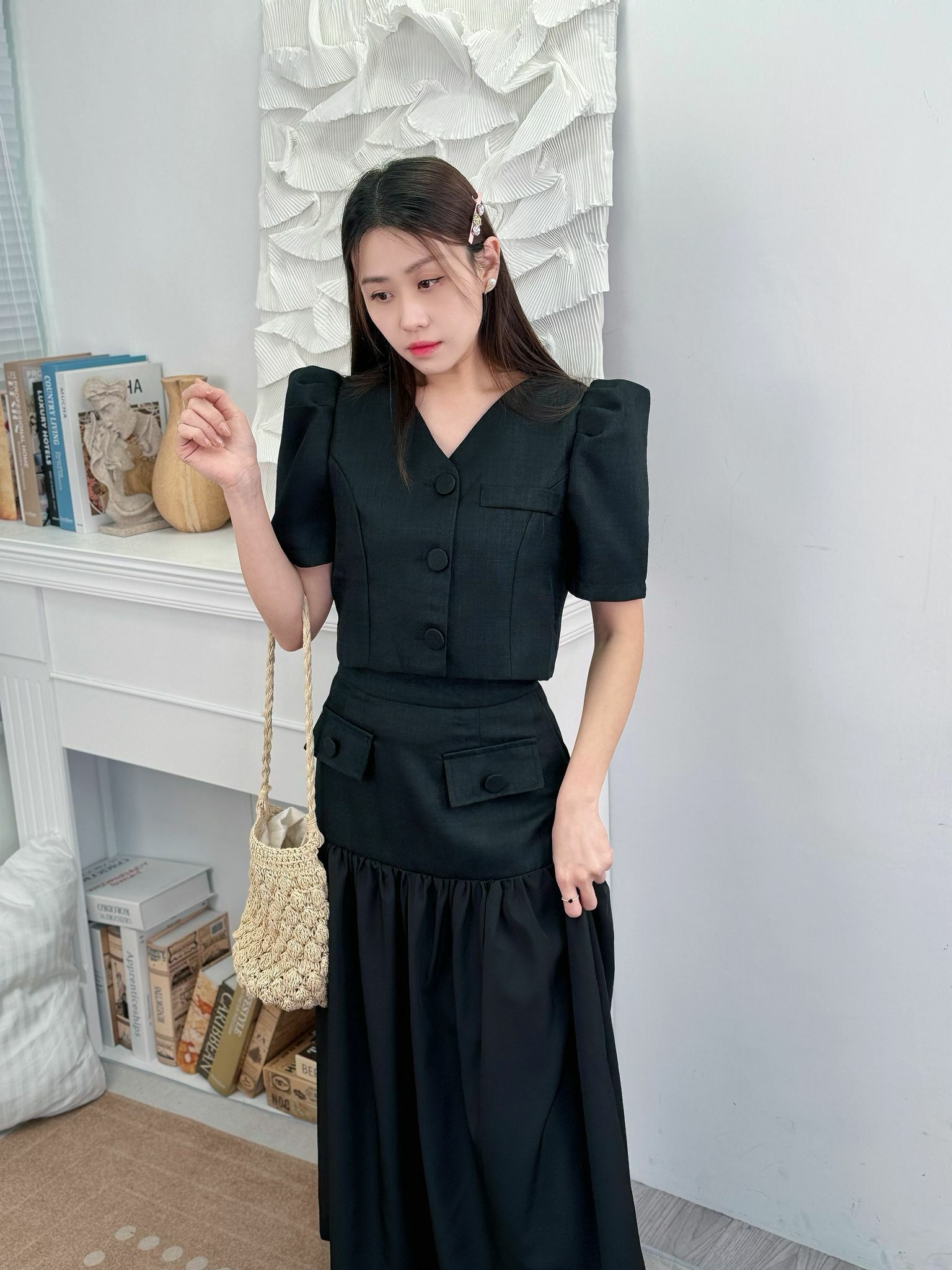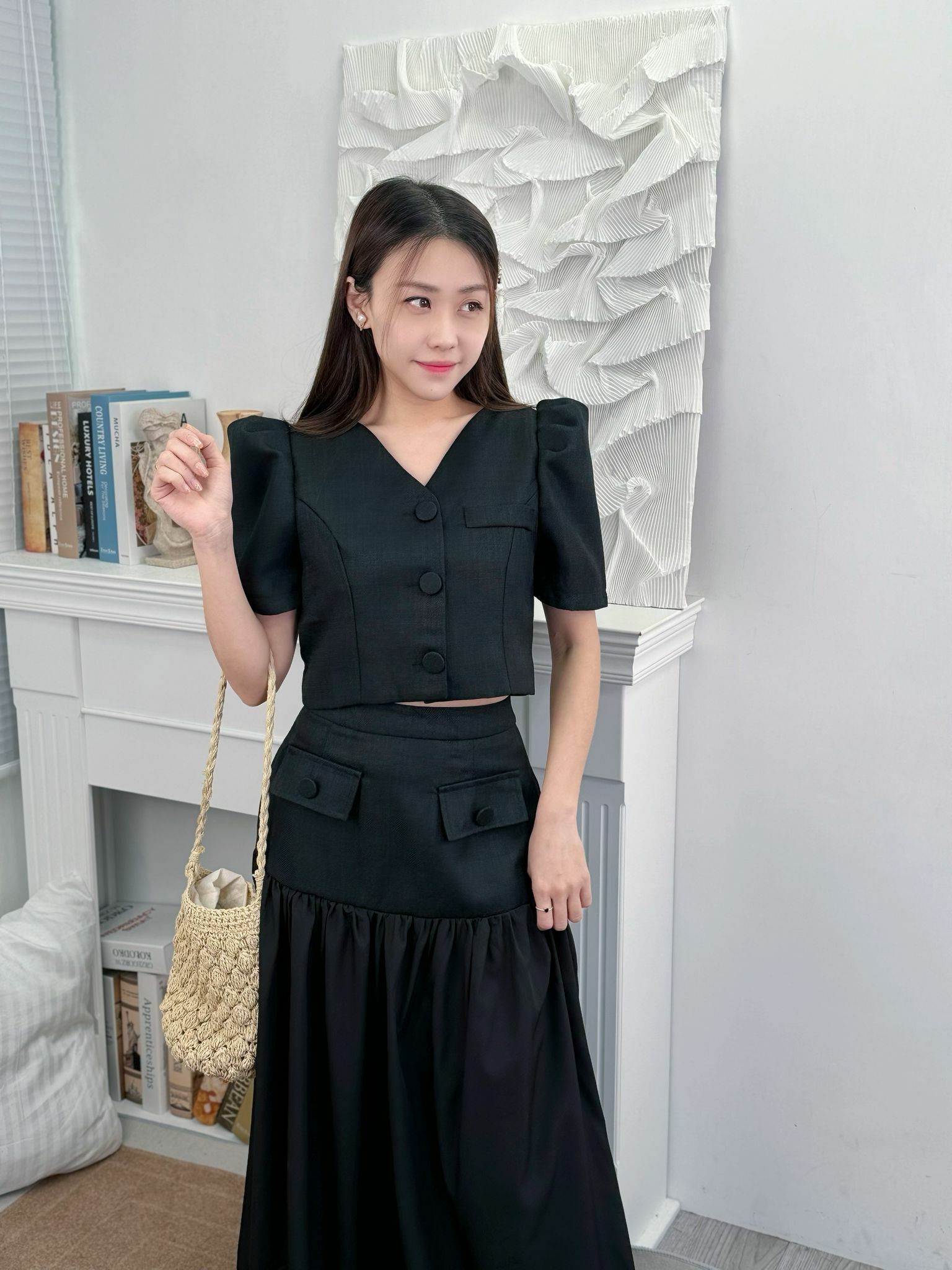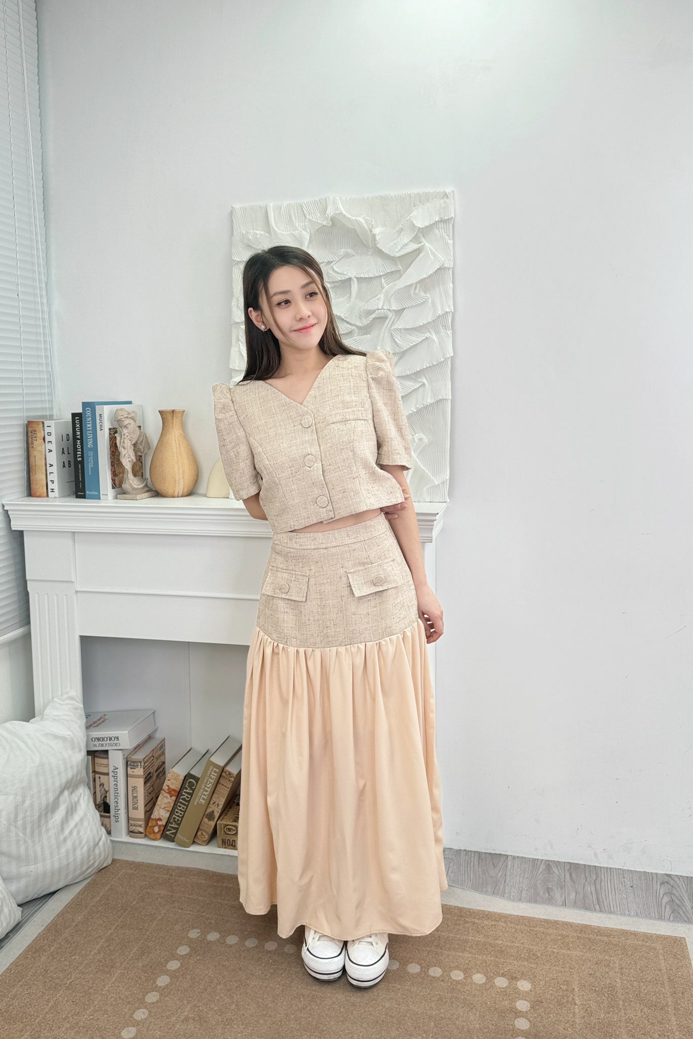 上身Blouse 短身設計巴同裙腰剛剛好可以接軌最大化地顯得成個身型好修長.
