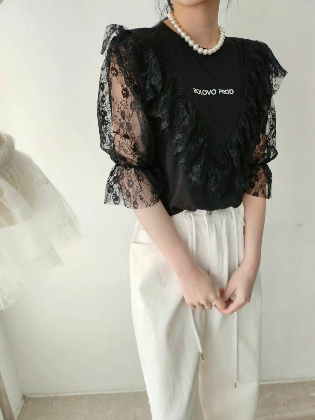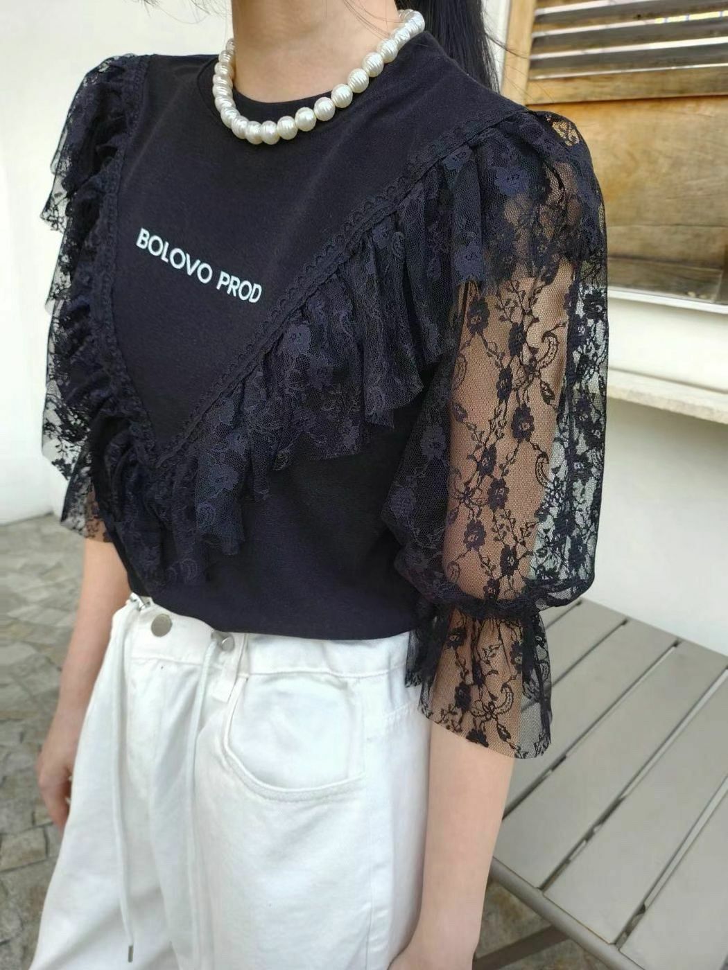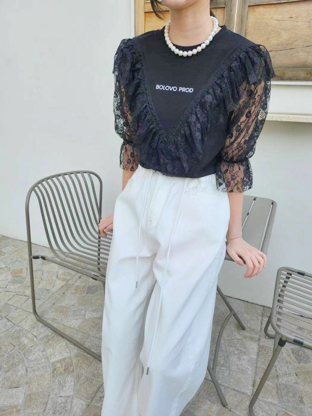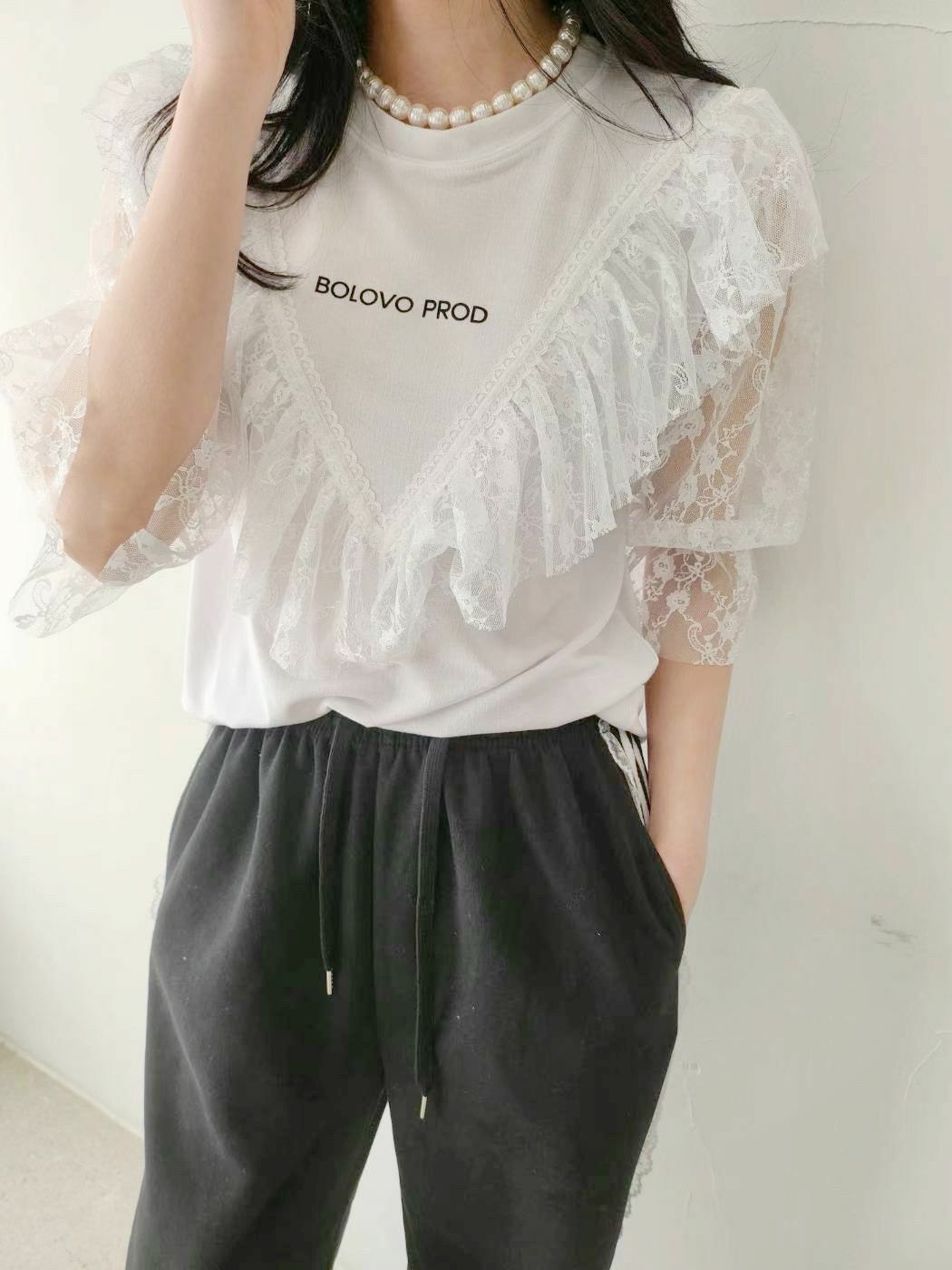 配上V型蕾絲拼接 + 荷葉邊ruffles設計,整體輪廓有層次感,帶住一點法式復古味。呢件嘢既可以 casual 又可以 elegant,微微嘅字母logo好低調但有細節感,cotton Tee 基底,soft touch,配 lace 但唔焗身,保留返 casual street vibe ⚡