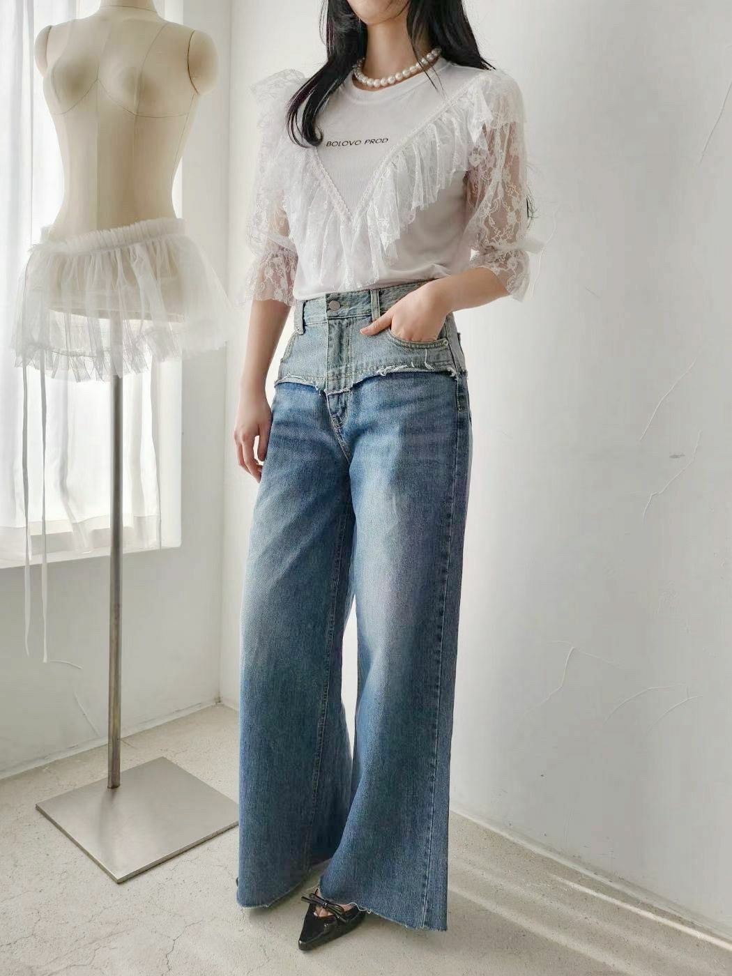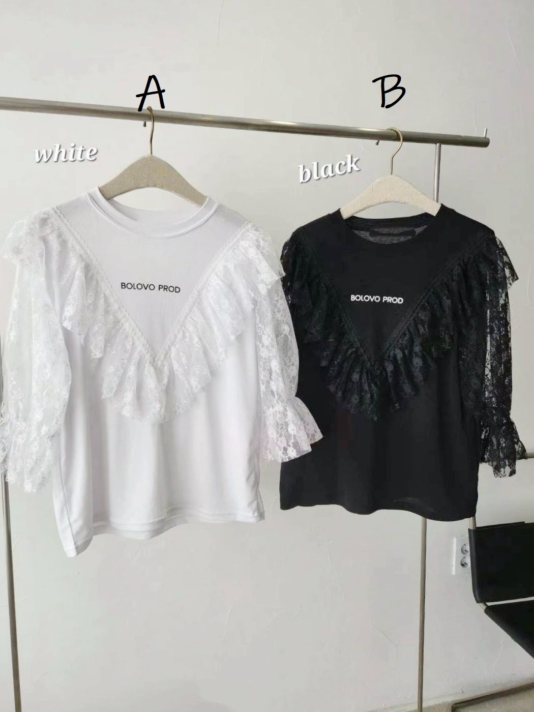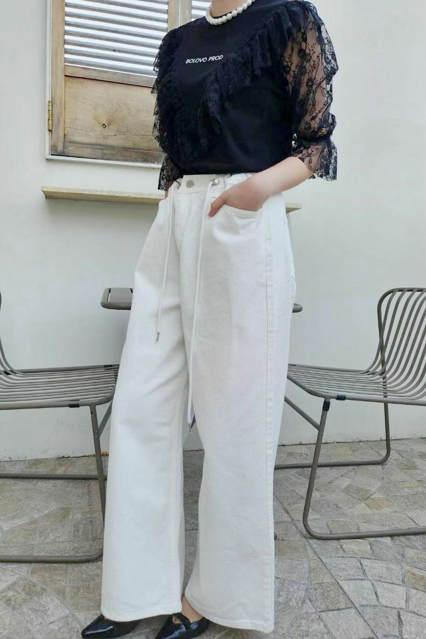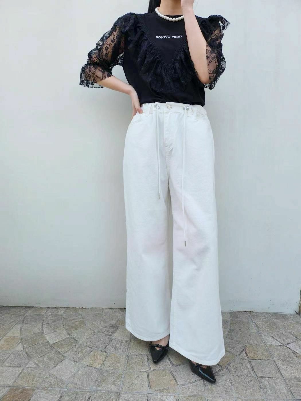 配上V型蕾絲拼接 + 荷葉邊ruffles設計,整體輪廓有層次感,帶住一點法式復古味。呢件嘢既可以 casual 又可以 elegant,微微嘅字母logo好低調但有細節感,cotton Tee 基底,soft touch,配 lace 但唔焗身,保留返 casual street vibe ⚡