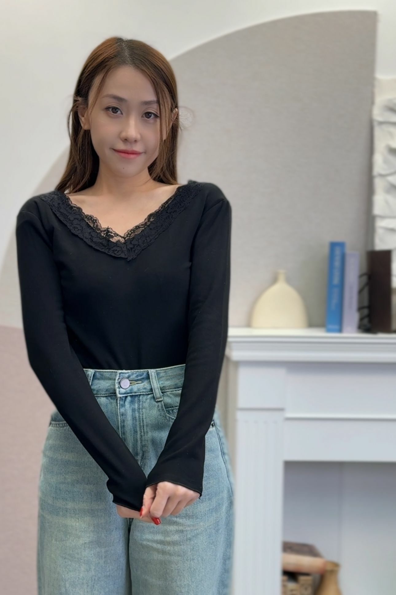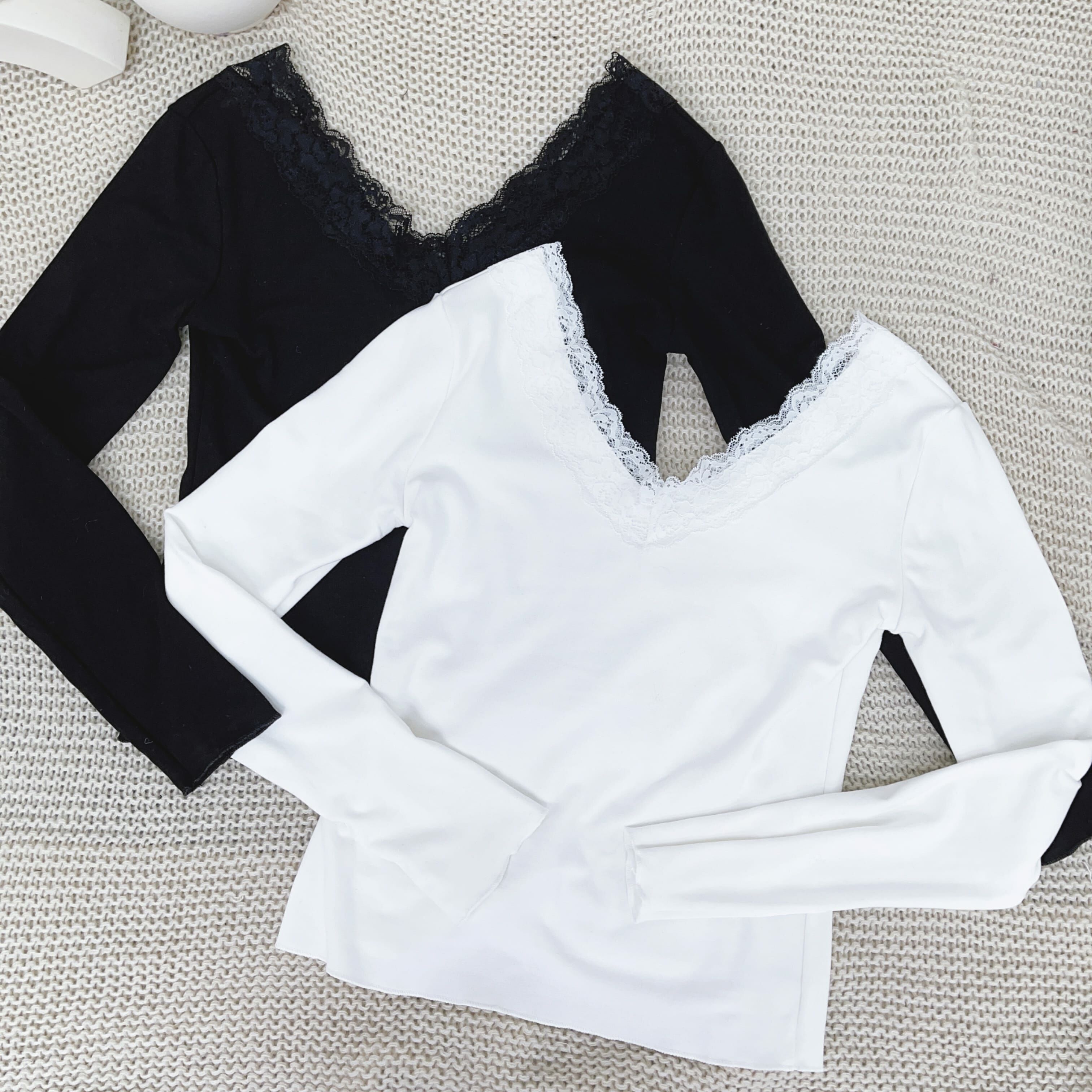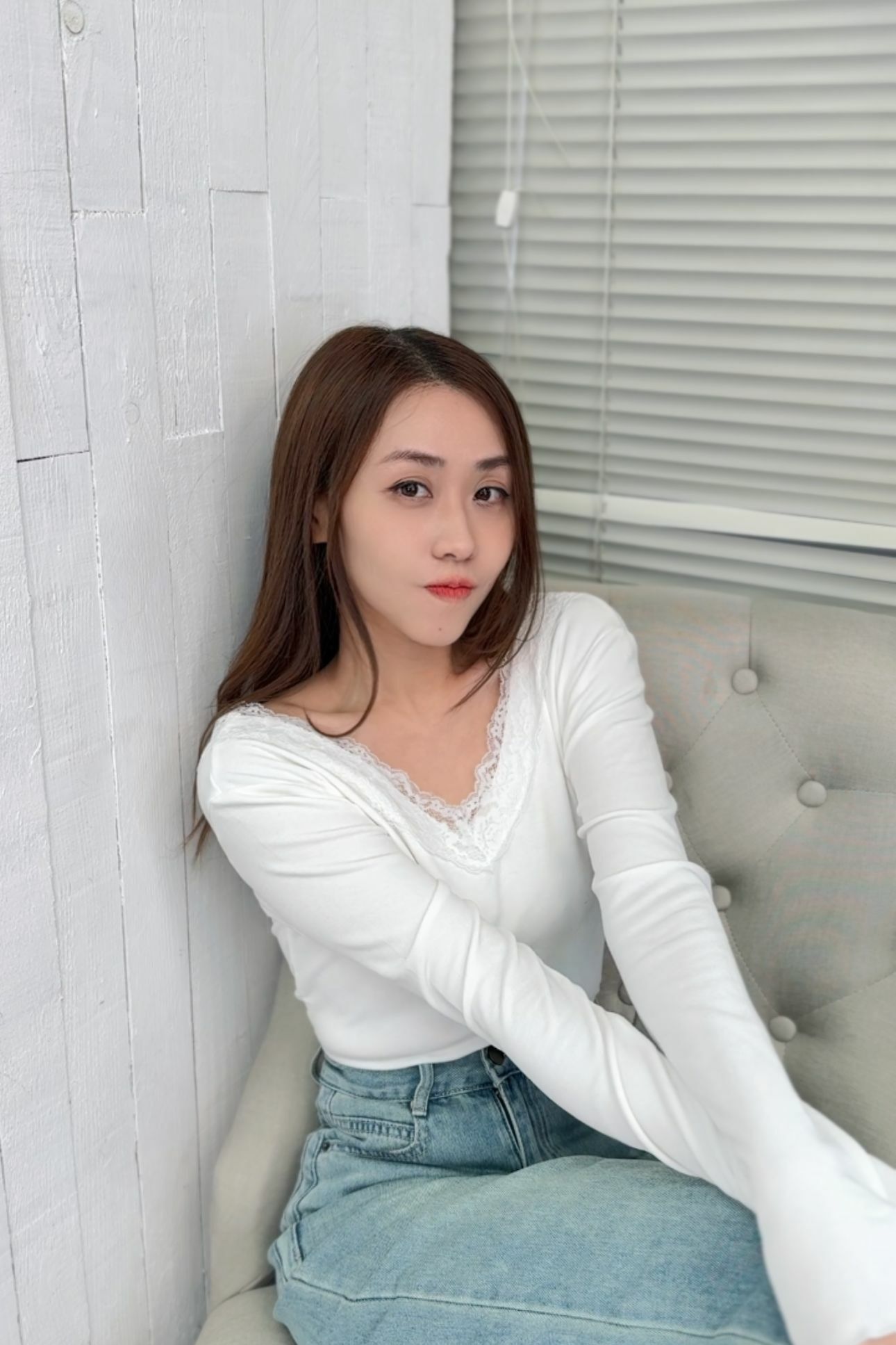 呢件深V領毛衣柔軟親膚,特別係深V加蕾絲滾邊嘅設計,將 collarbone highlight 到剛剛好~上身即刻溫柔女神感滿分!