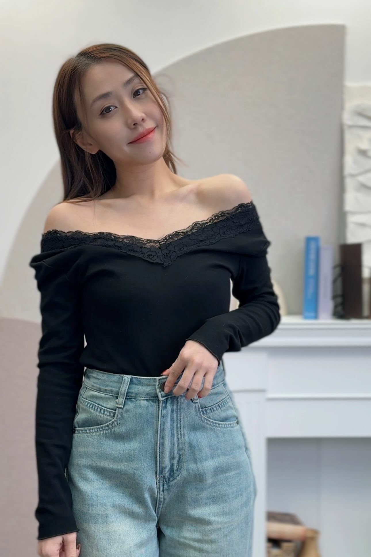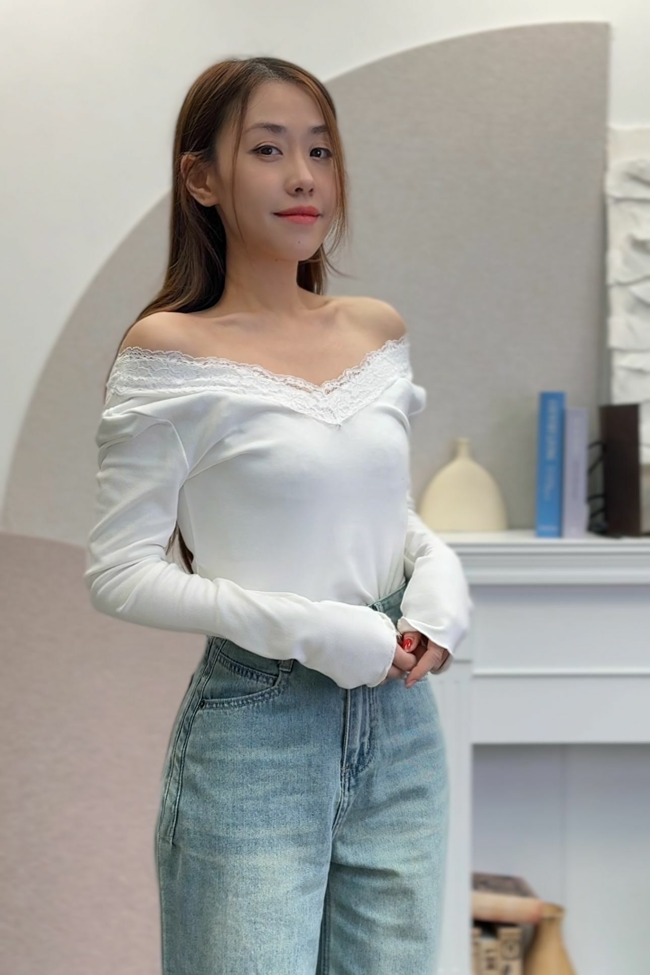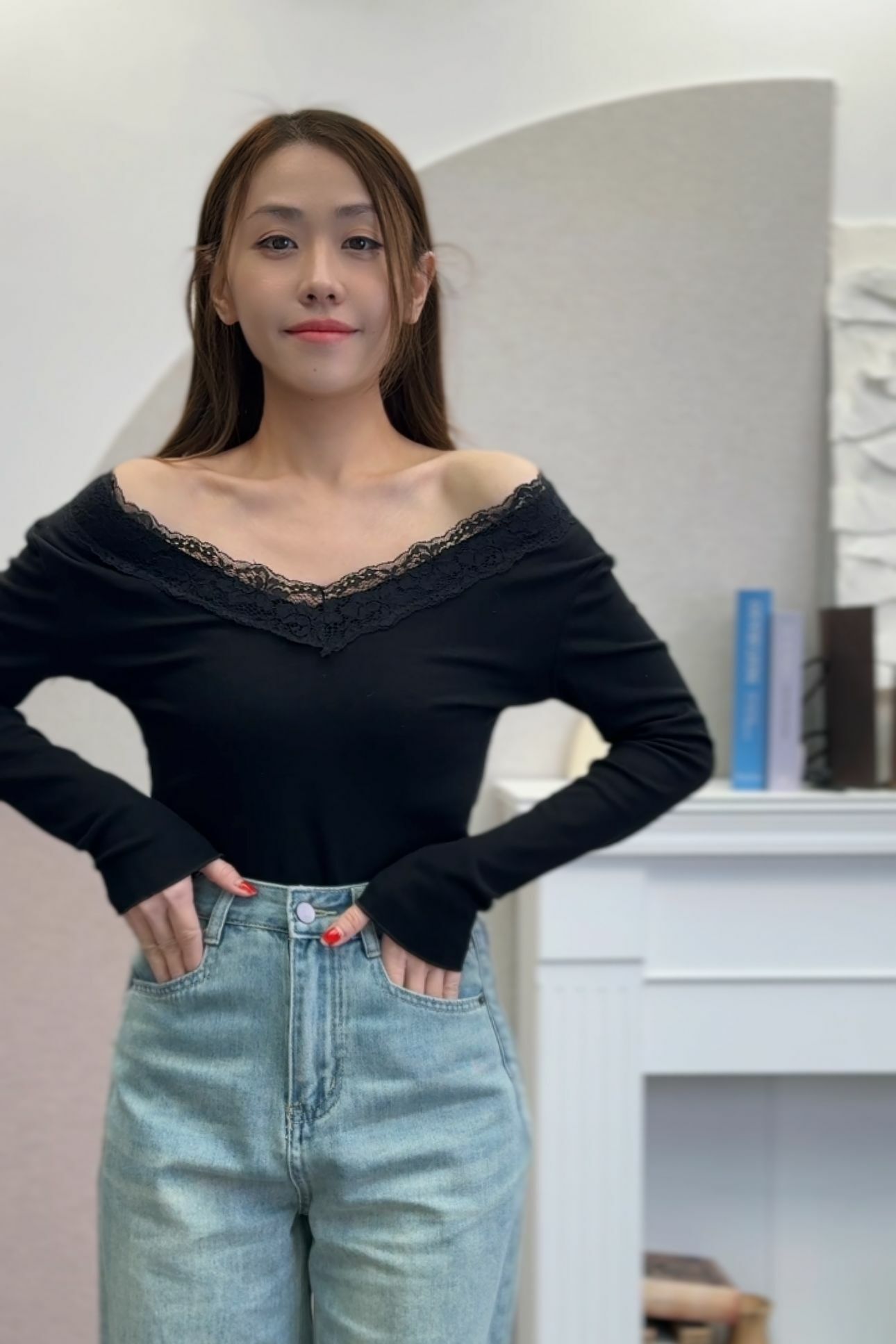 呢件深V領毛衣柔軟親膚,特別係深V加蕾絲滾邊嘅設計,將 collarbone highlight 到剛剛好~上身即刻溫柔女神感滿分!