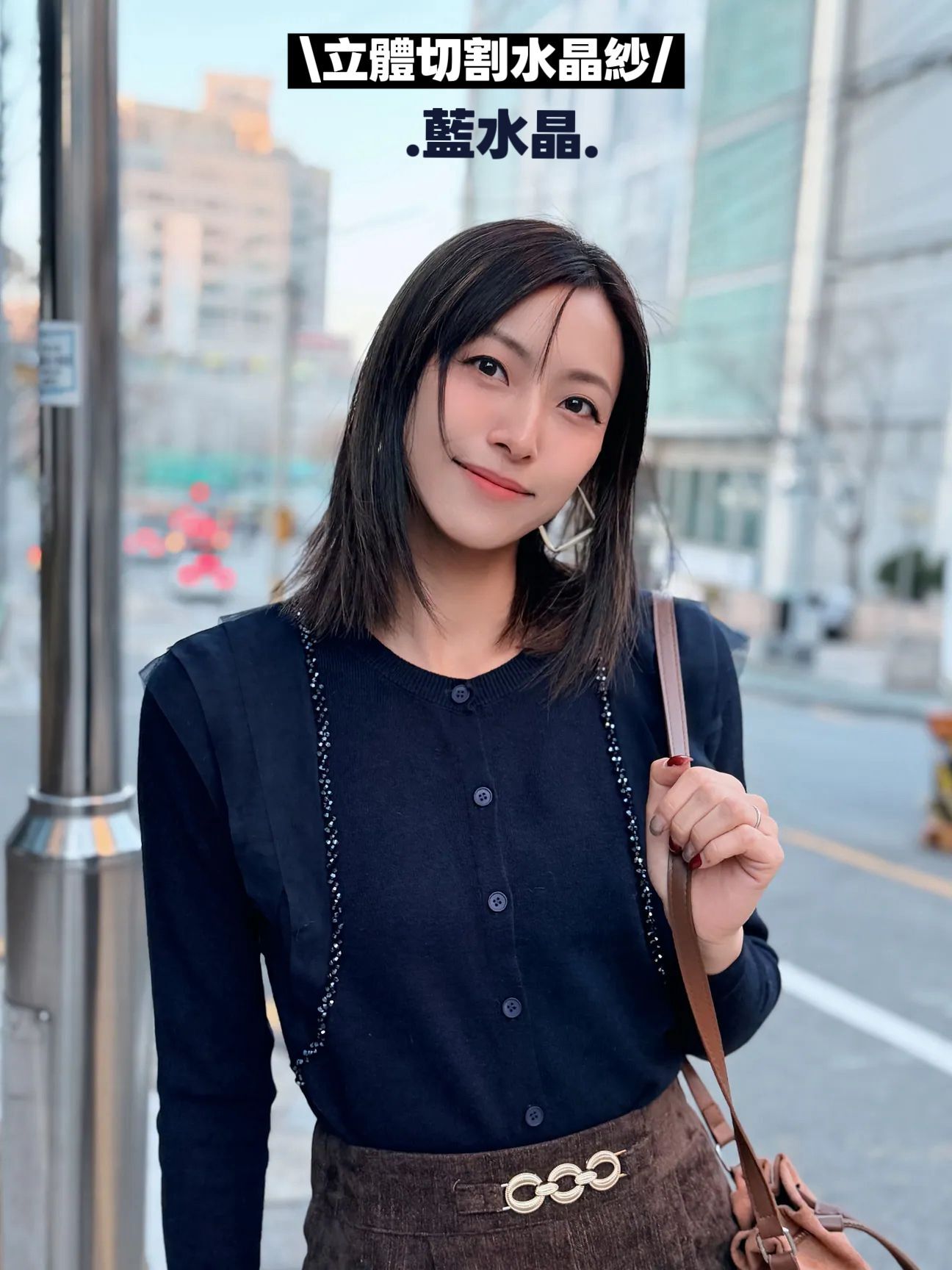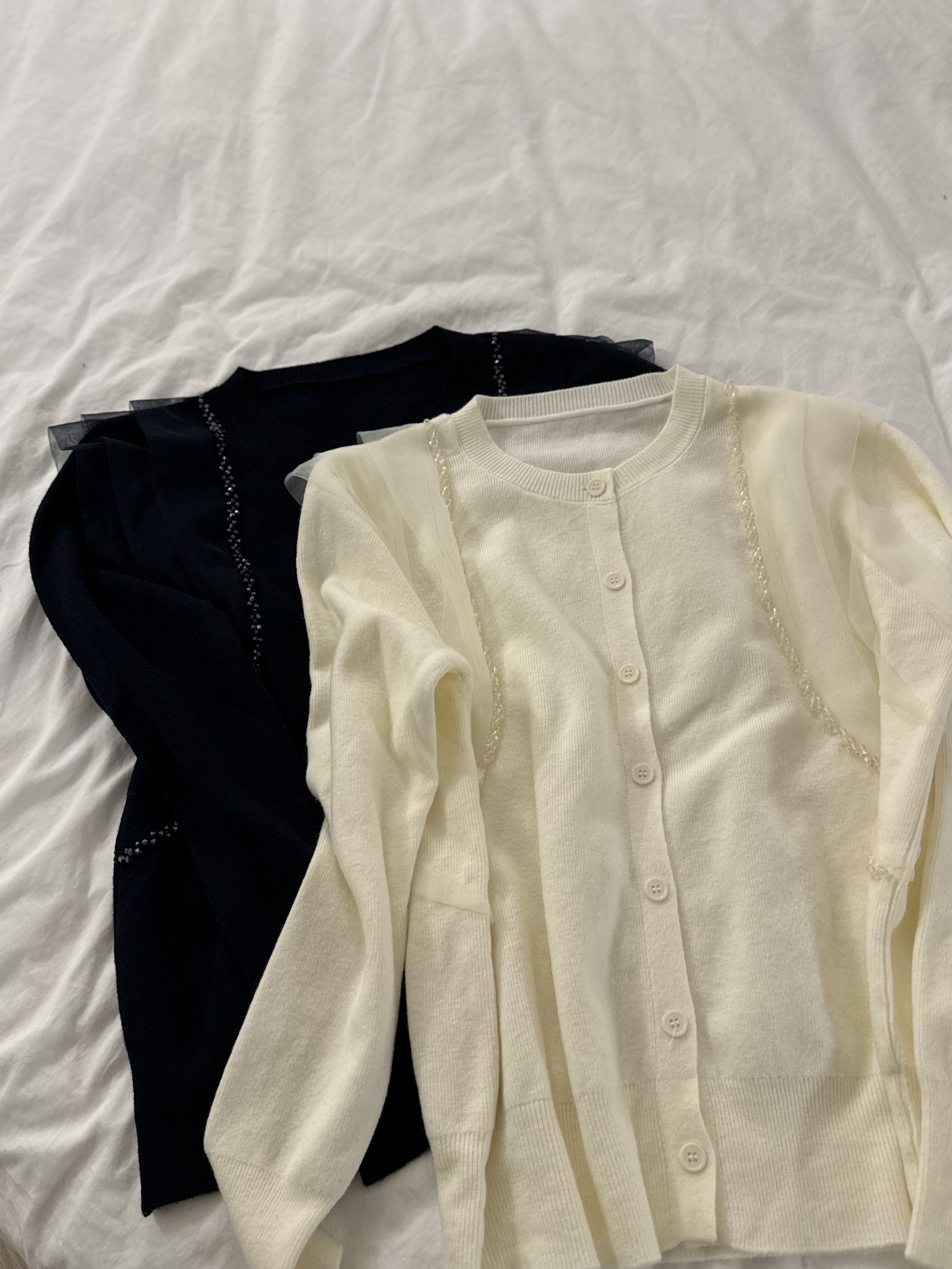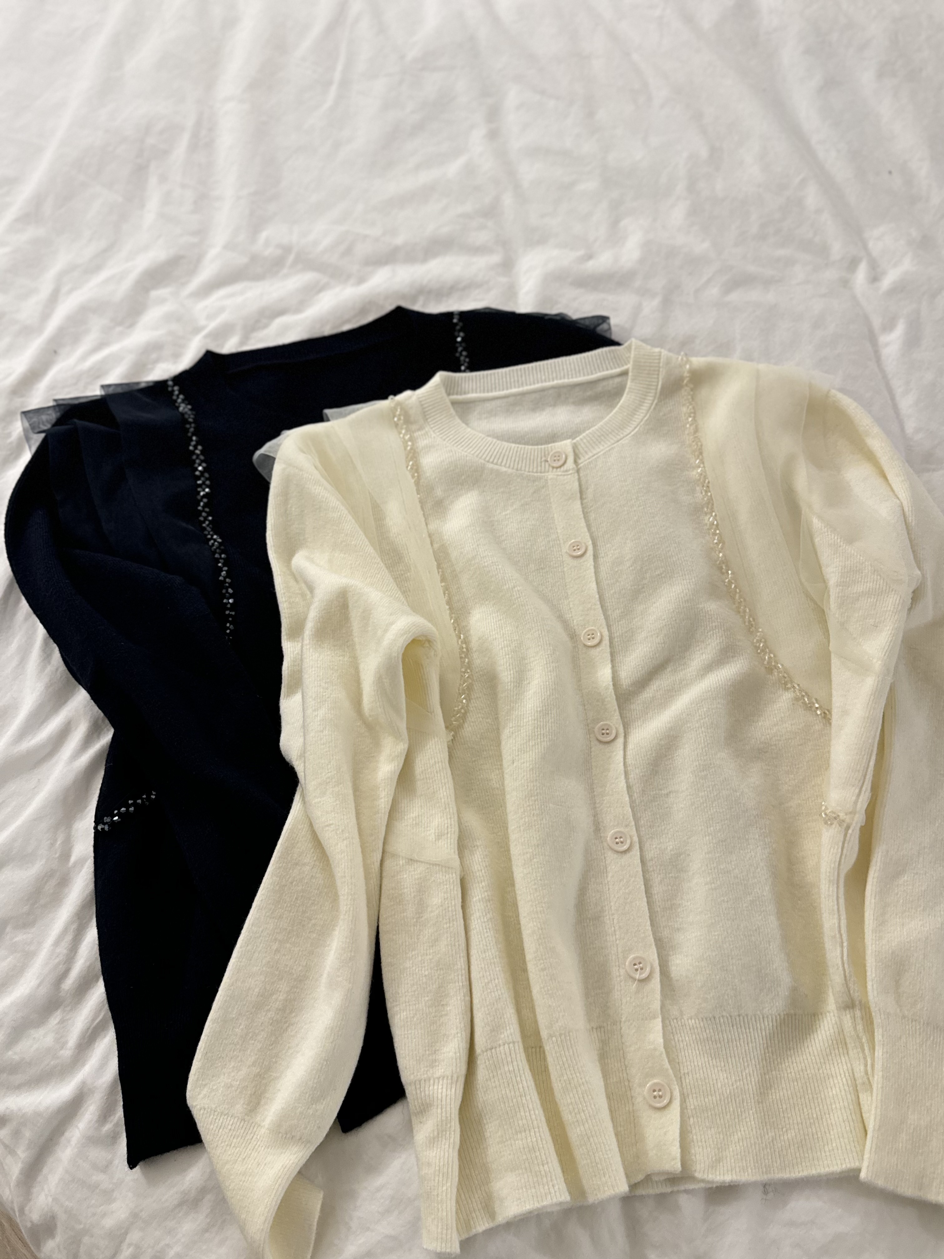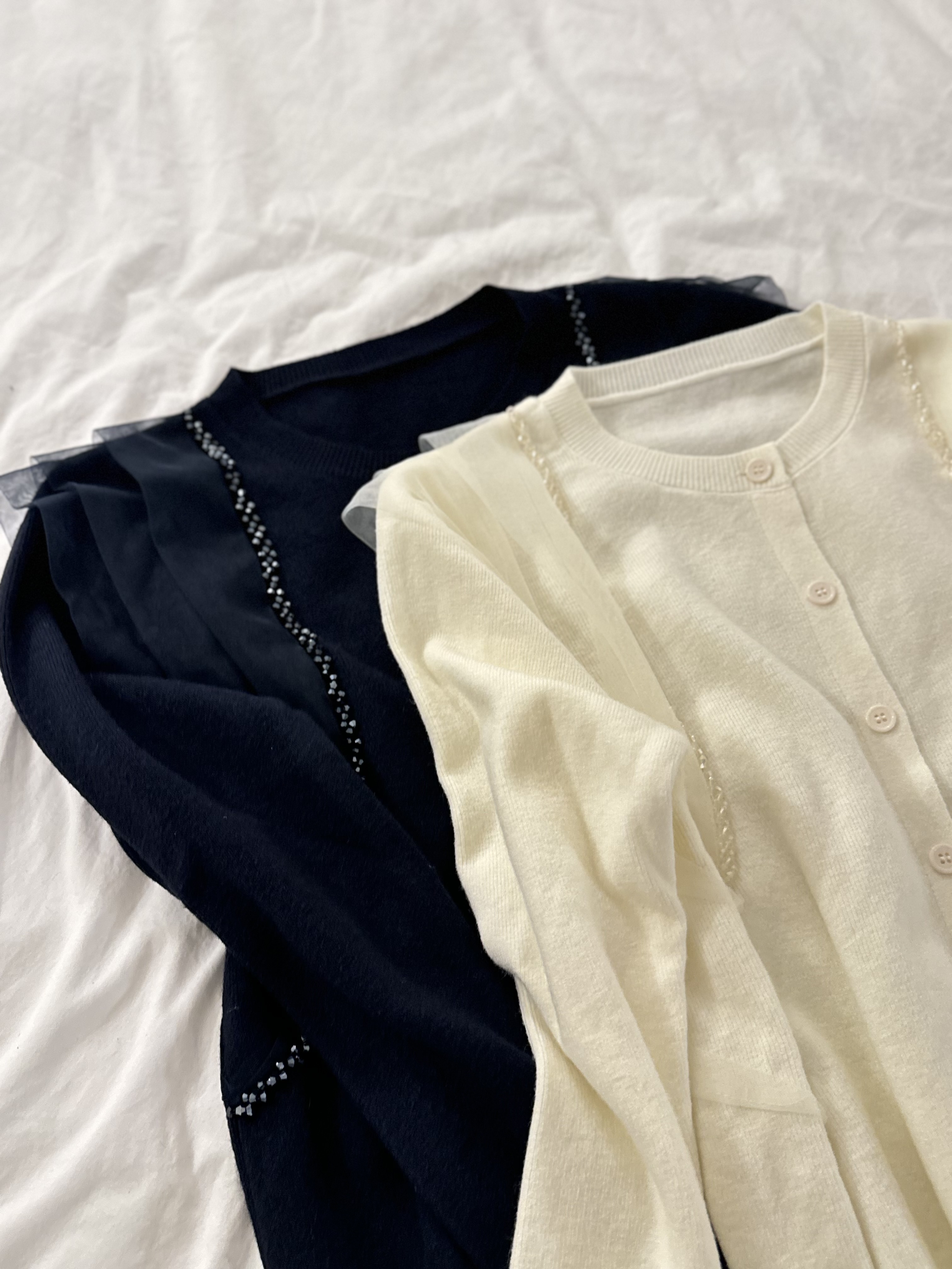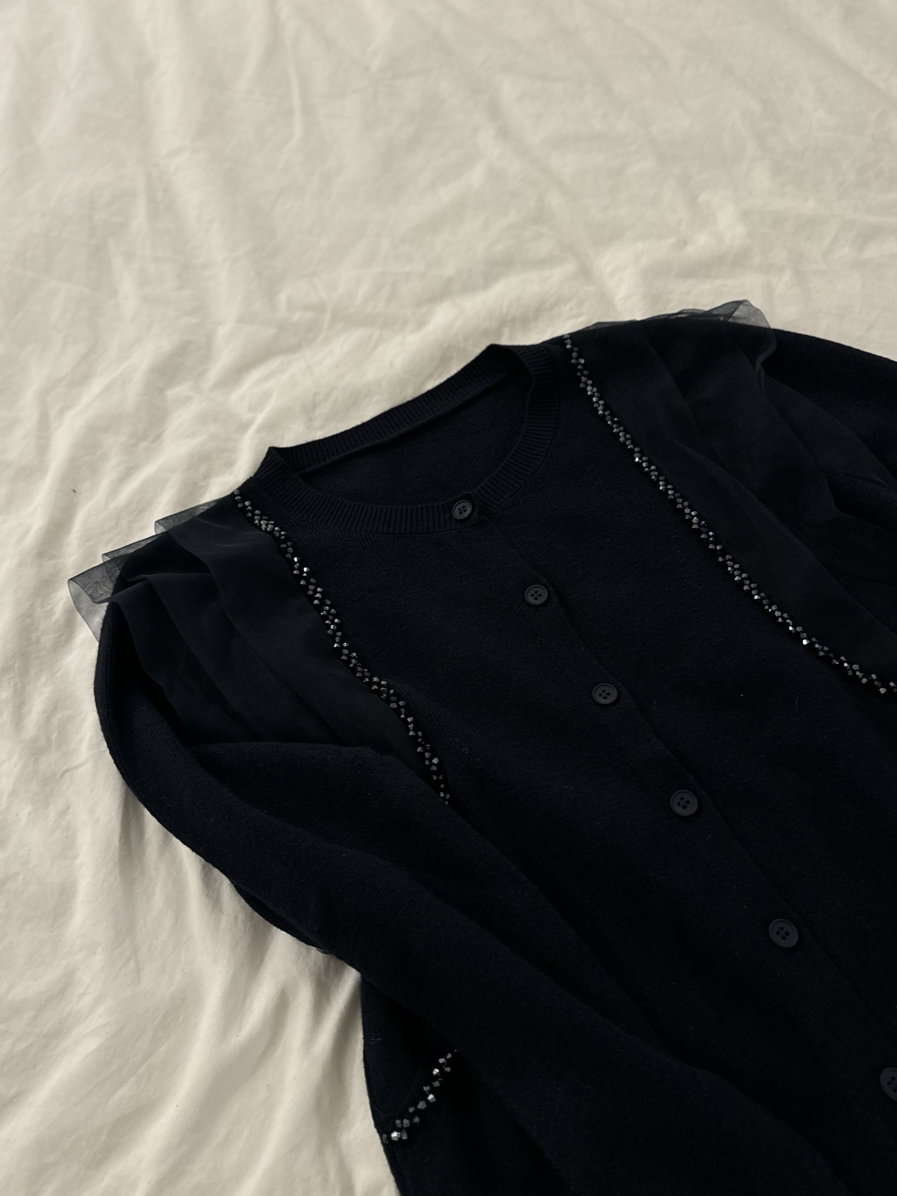 會帶黎華麗感嘅藍水晶邊邊好多切割面~實物會覺得燈光反射得好靚‼️細細粒但小Bling Bling😚水晶精緻位仲會視覺上向內修窄左個身~氣質感超好~併上嘅重疊紗邊輕奢得好淡雅但紗同水晶嘅入肩式層次著上身真係會令成個人睇左slim 好多Made in Korea
