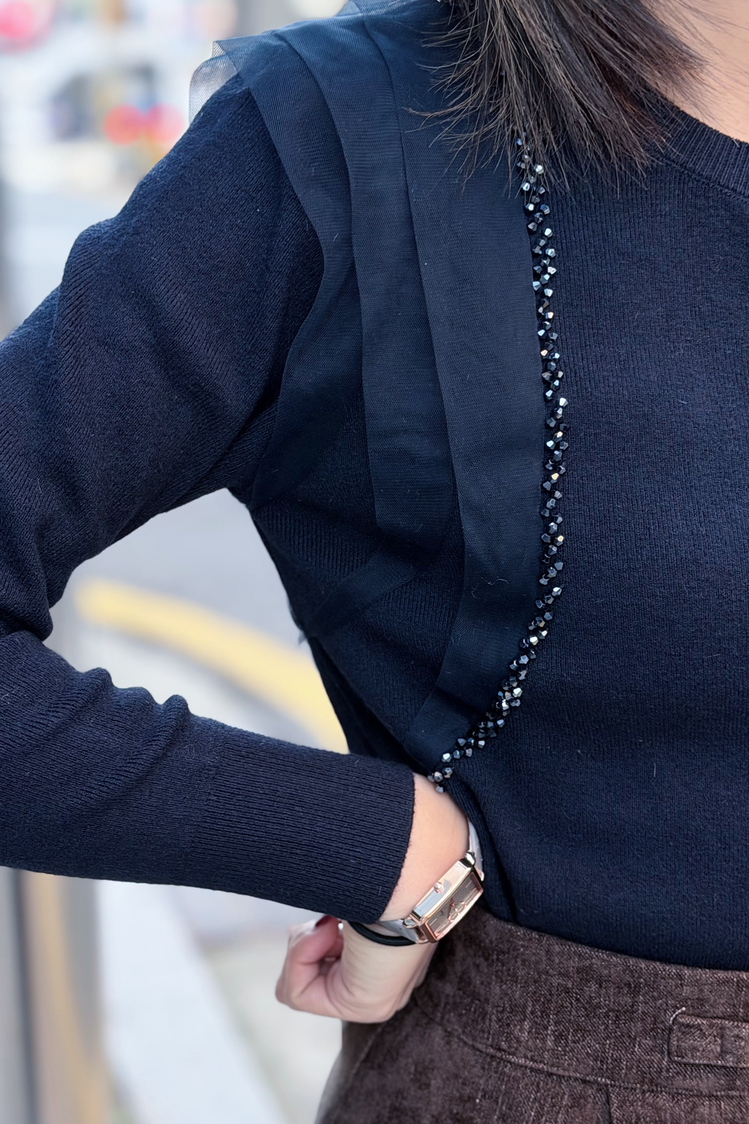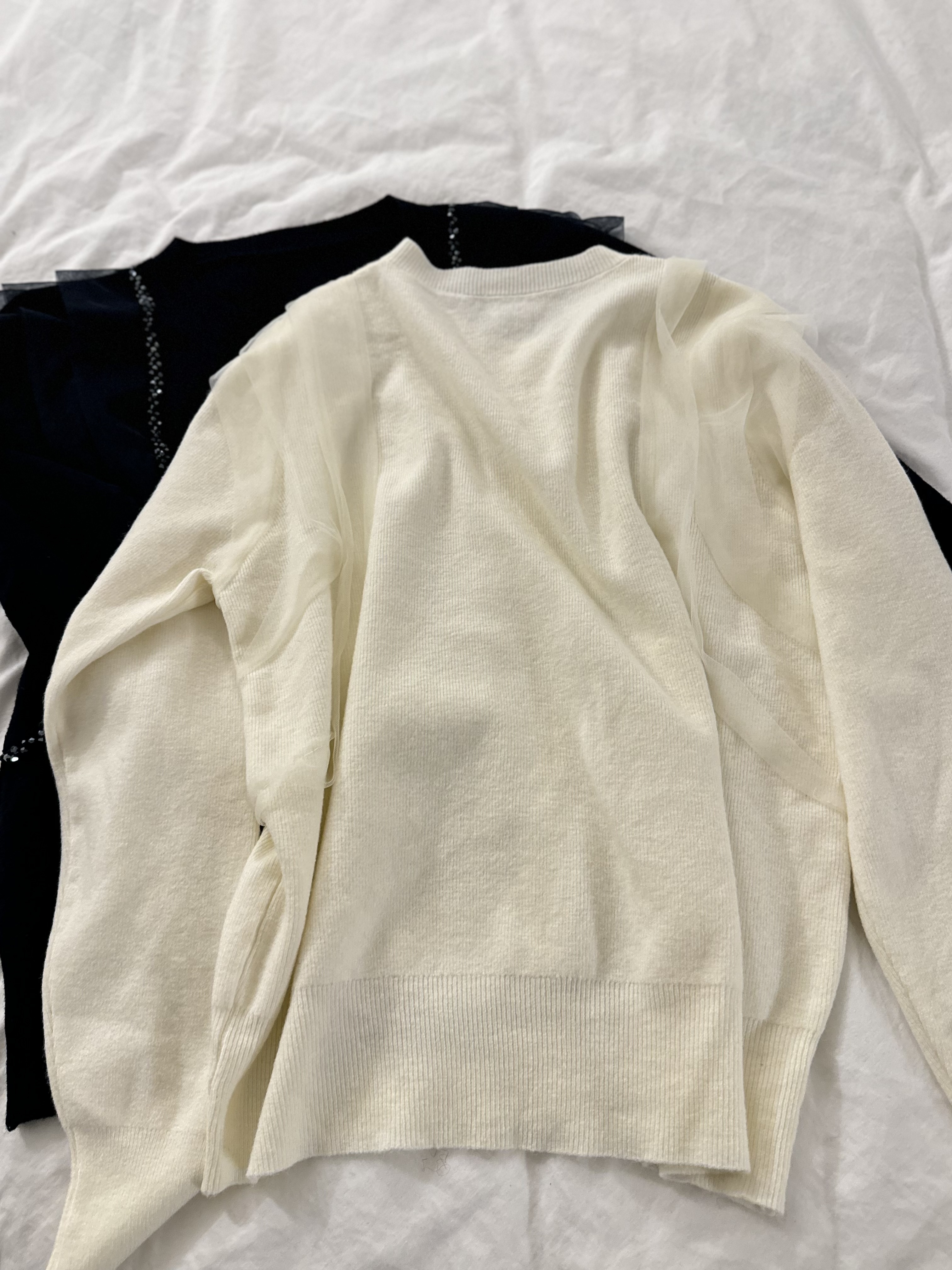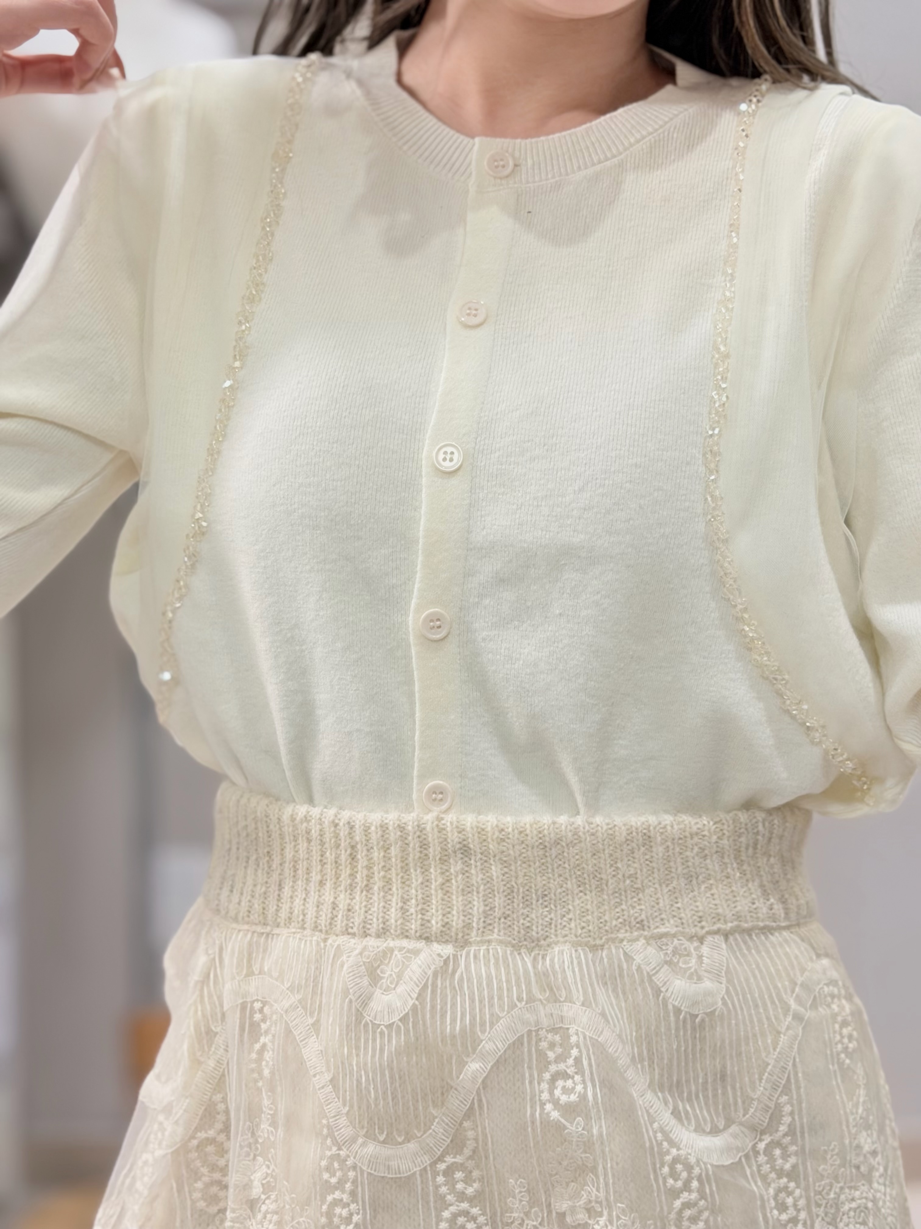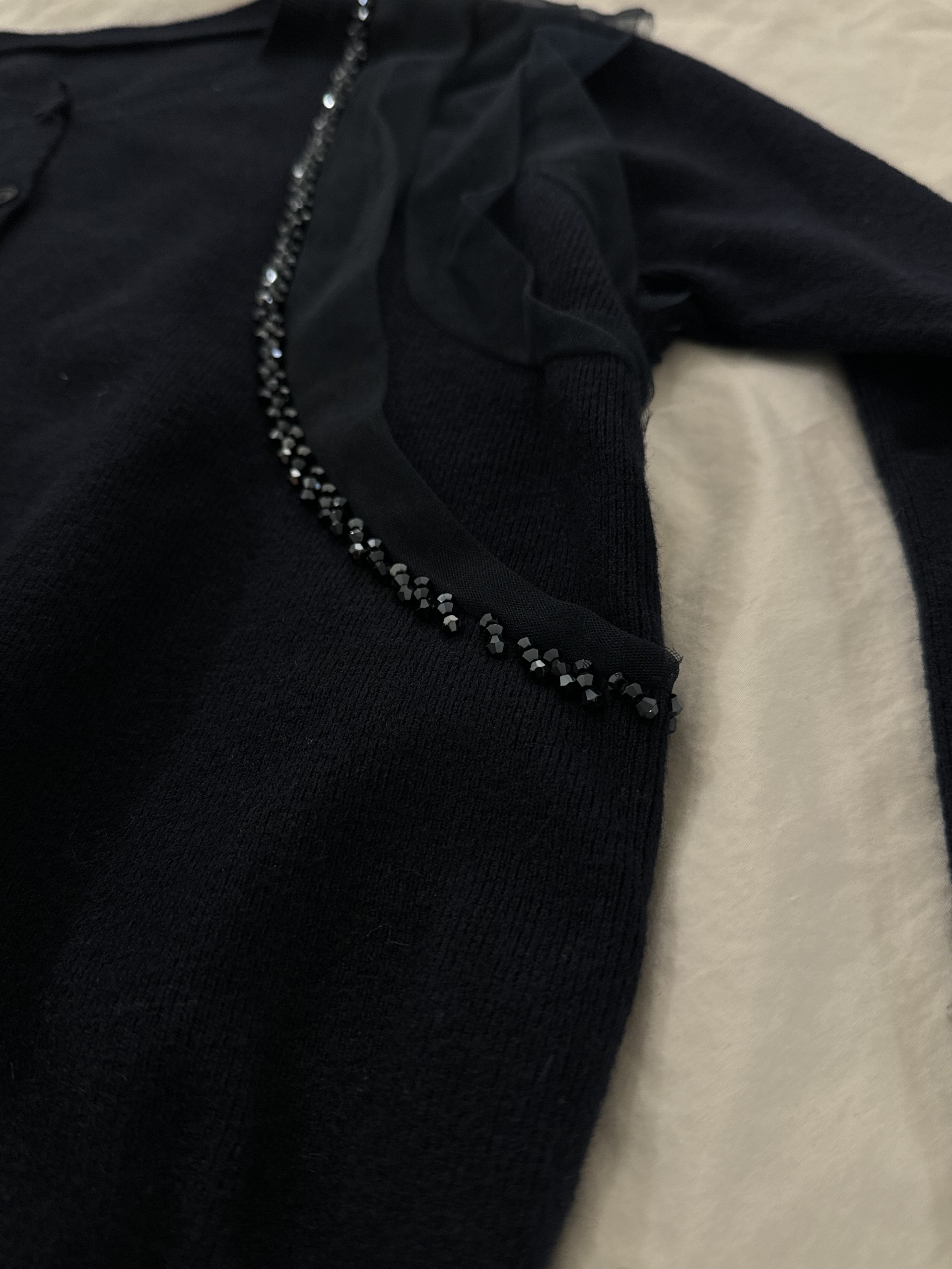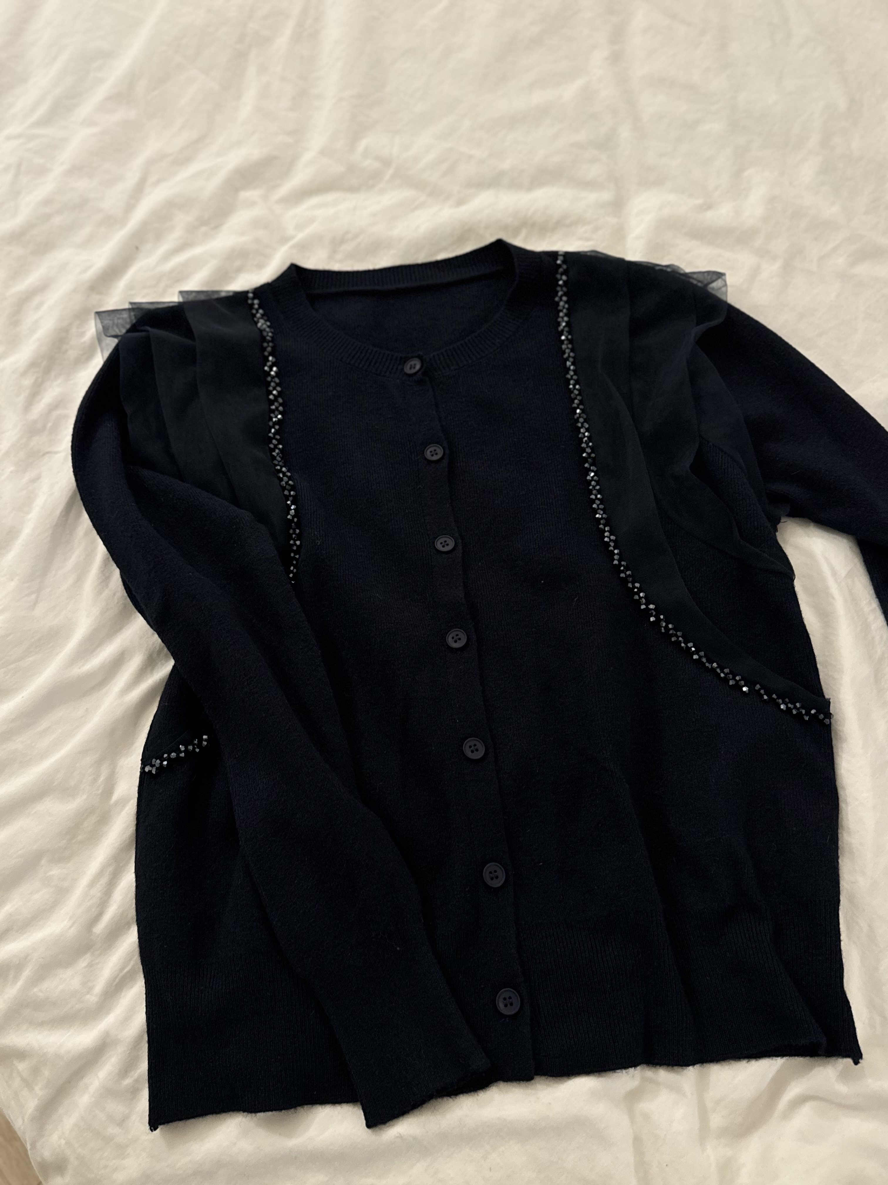 會帶黎華麗感嘅藍水晶邊邊好多切割面~實物會覺得燈光反射得好靚‼️細細粒但小Bling Bling😚水晶精緻位仲會視覺上向內修窄左個身~氣質感超好~併上嘅重疊紗邊輕奢得好淡雅但紗同水晶嘅入肩式層次著上身真係會令成個人睇左slim 好多Made in Korea
