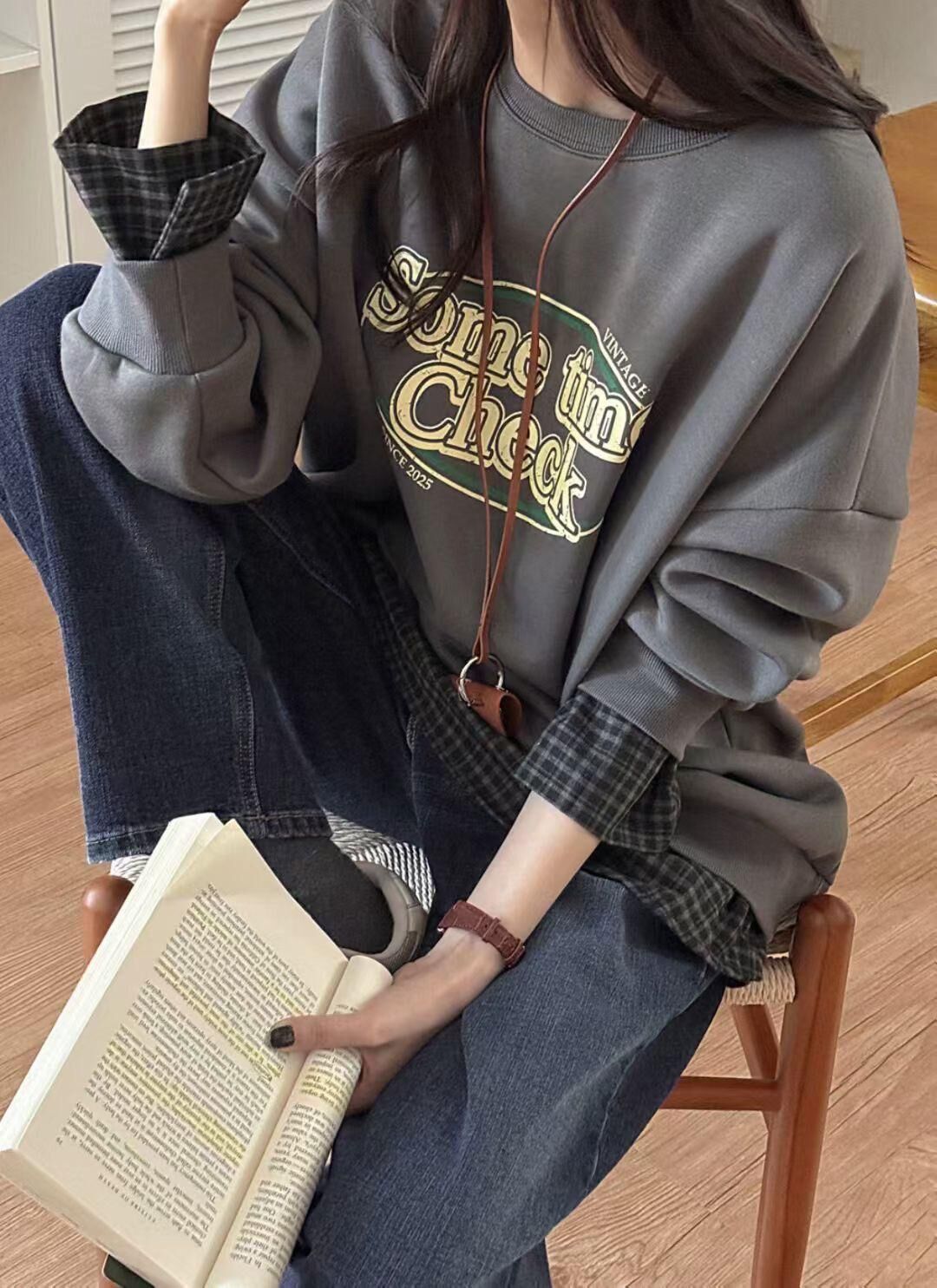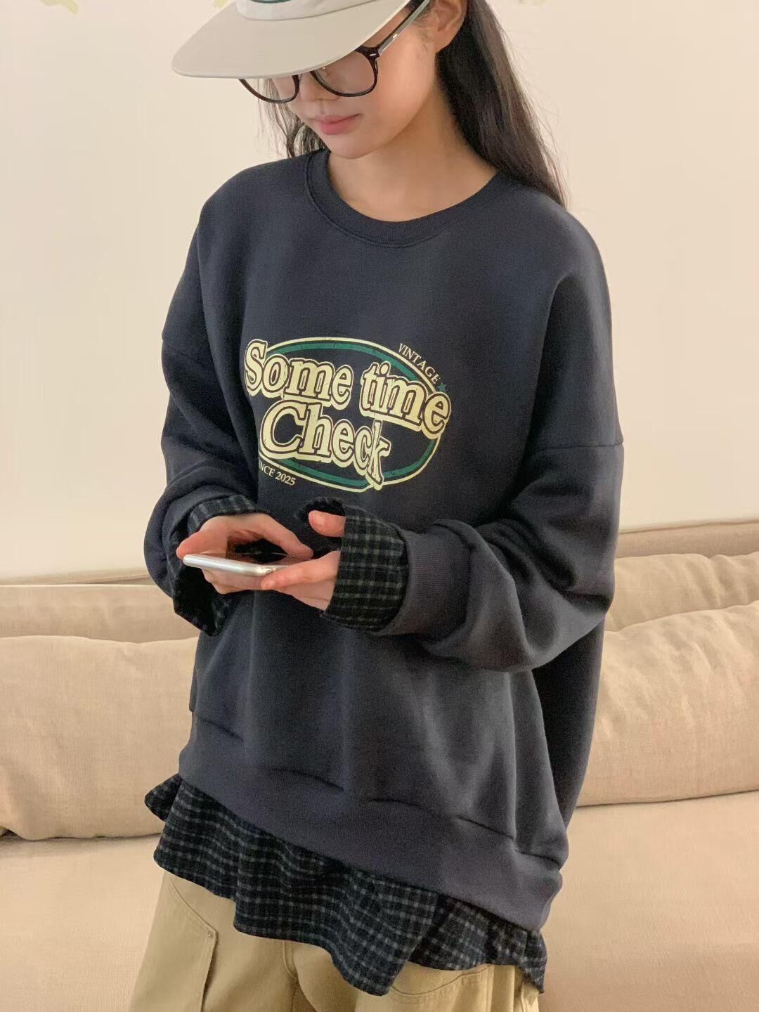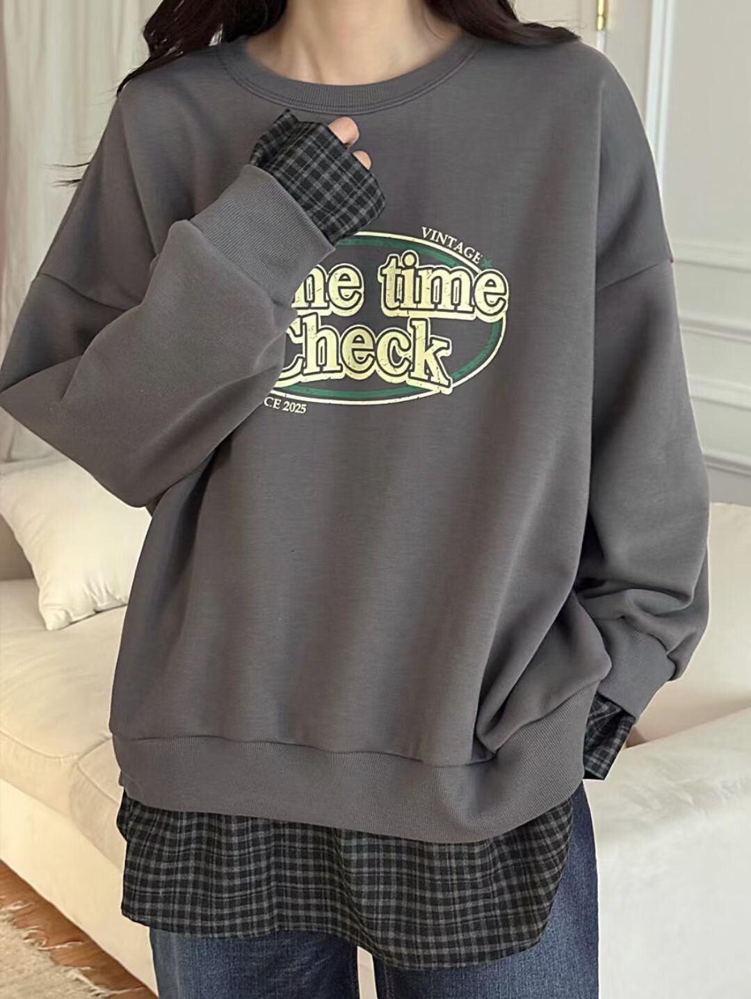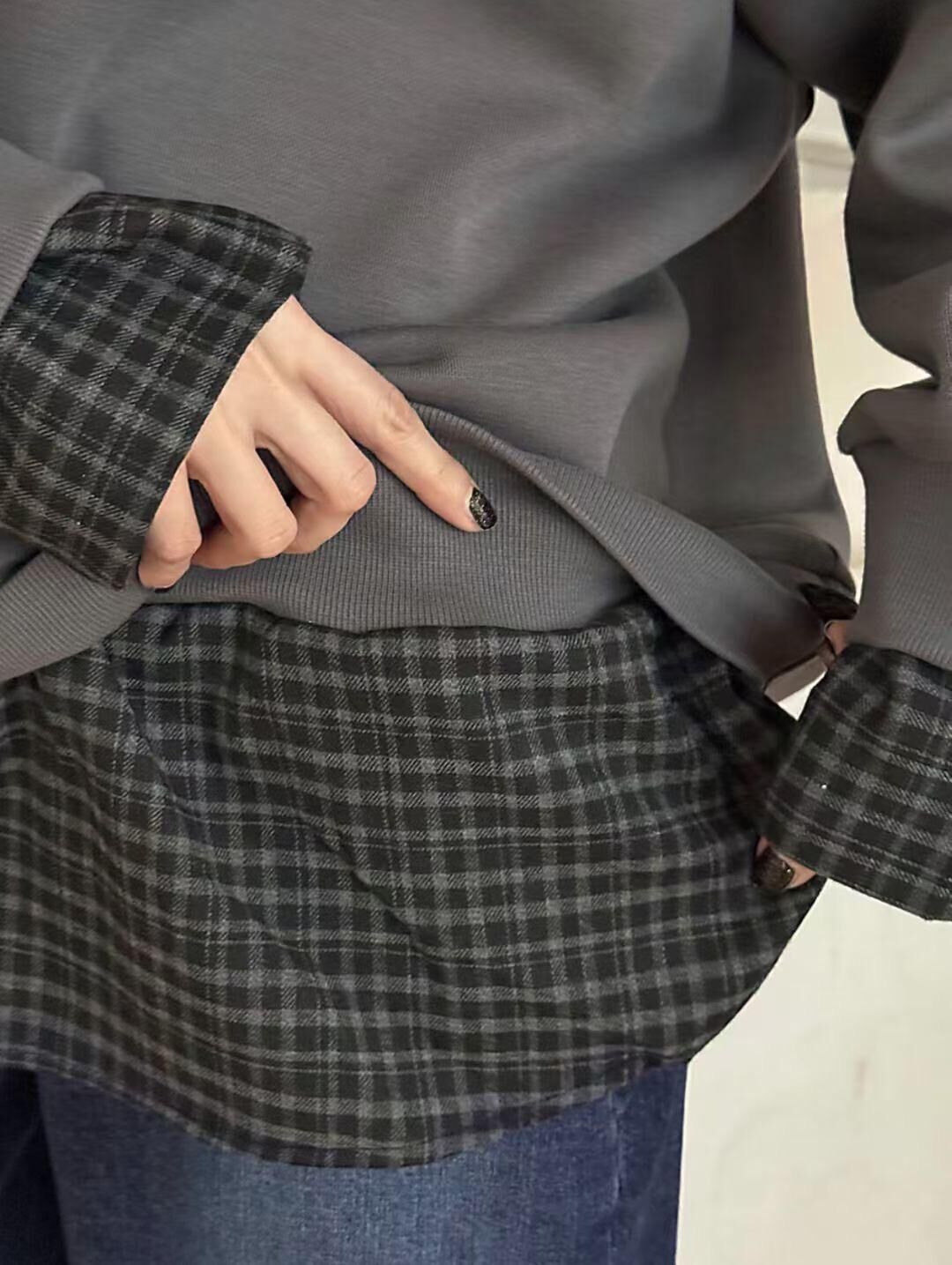H1027🤎格紋拼接假兩件衛衣