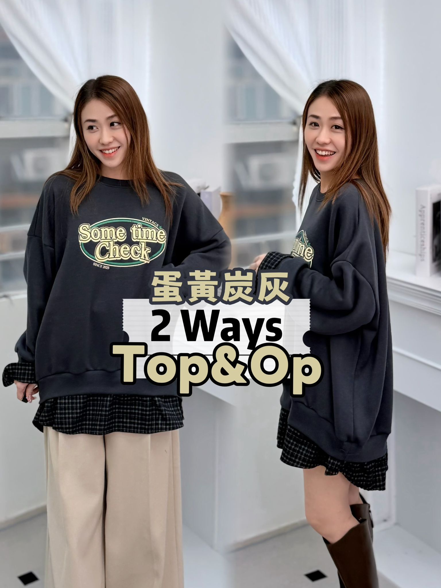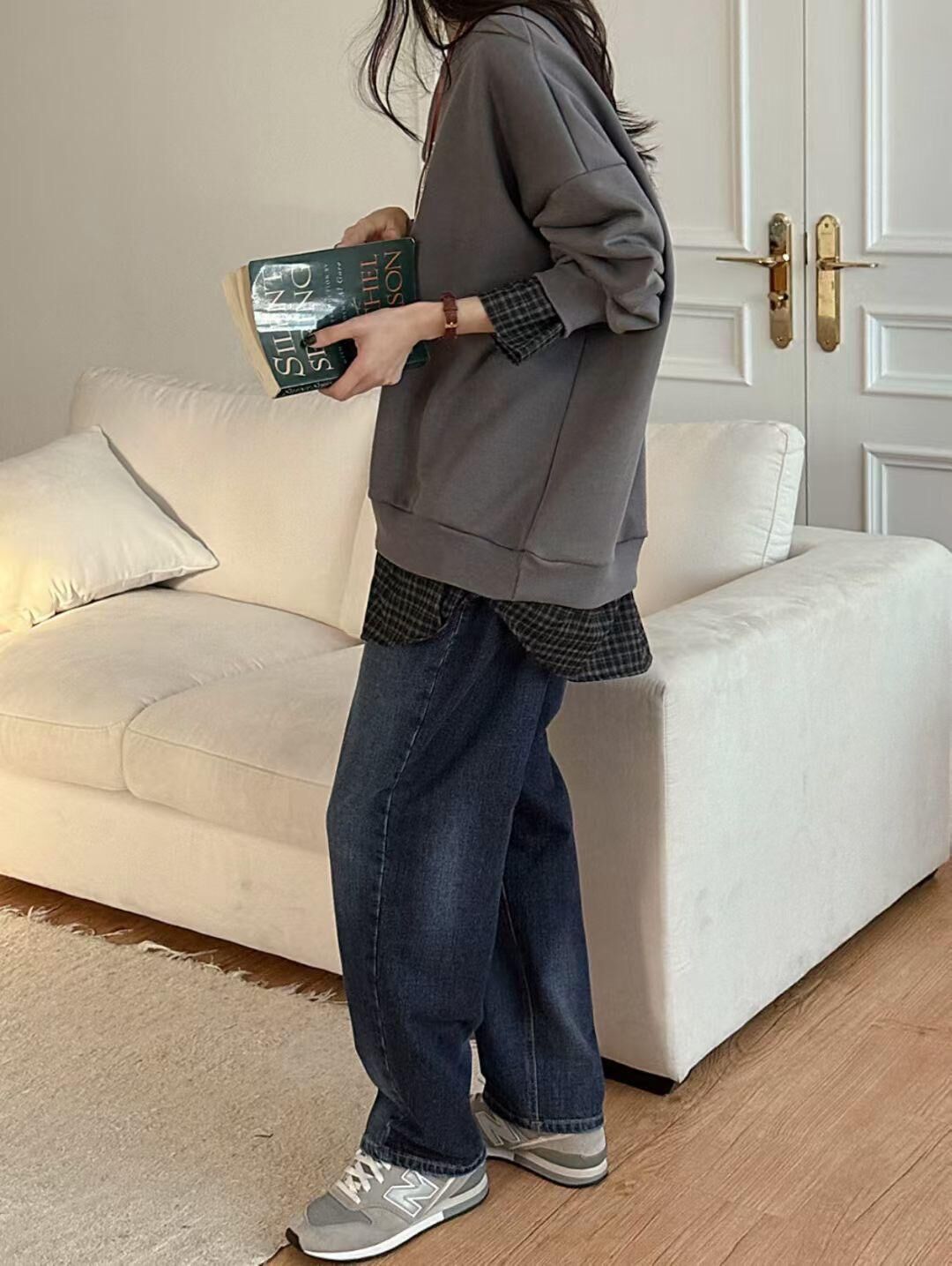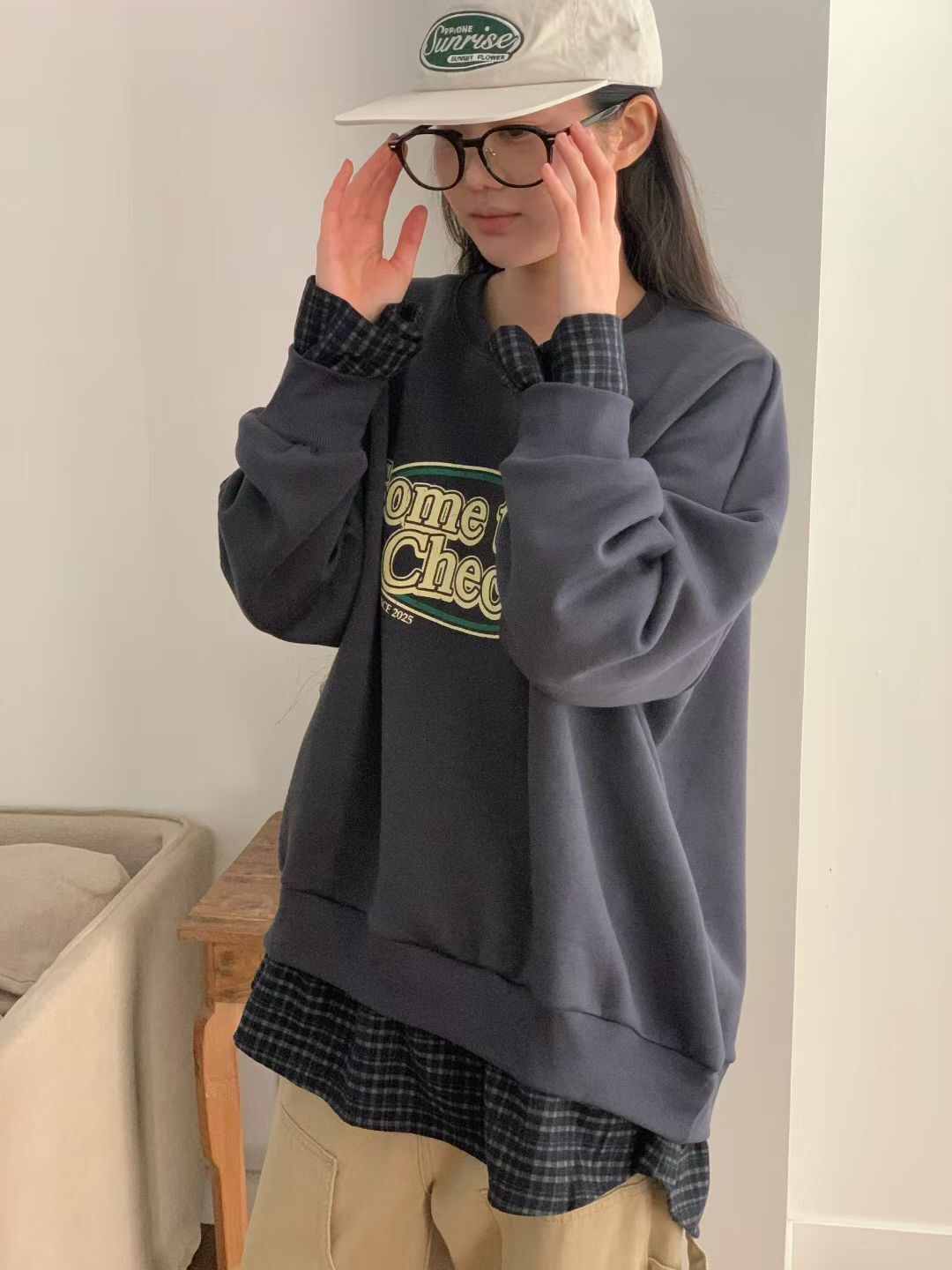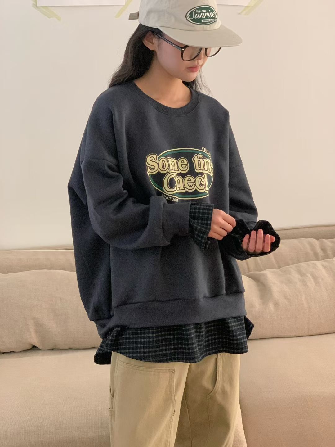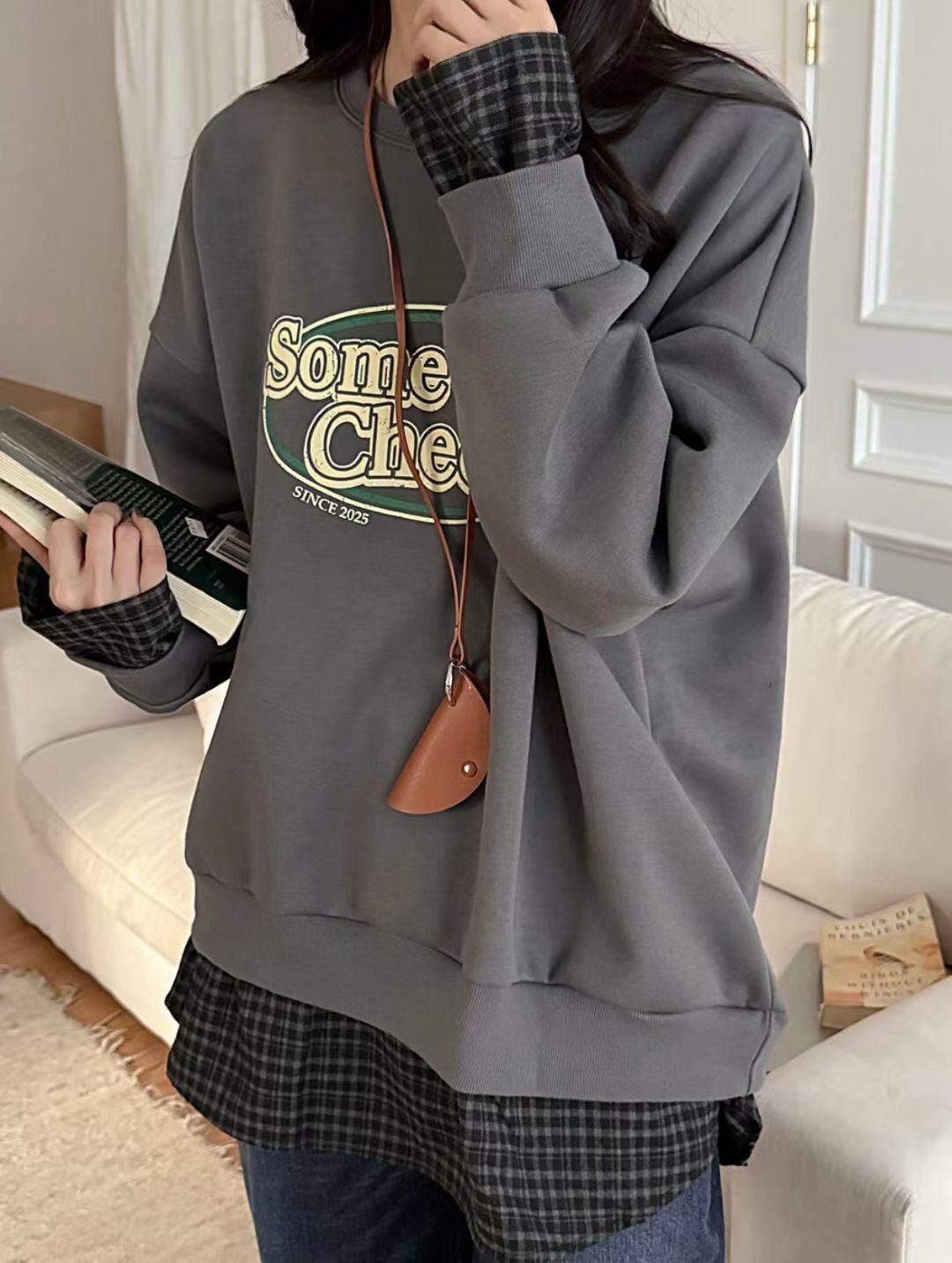 H1027🤎格紋拼接假兩件衛衣